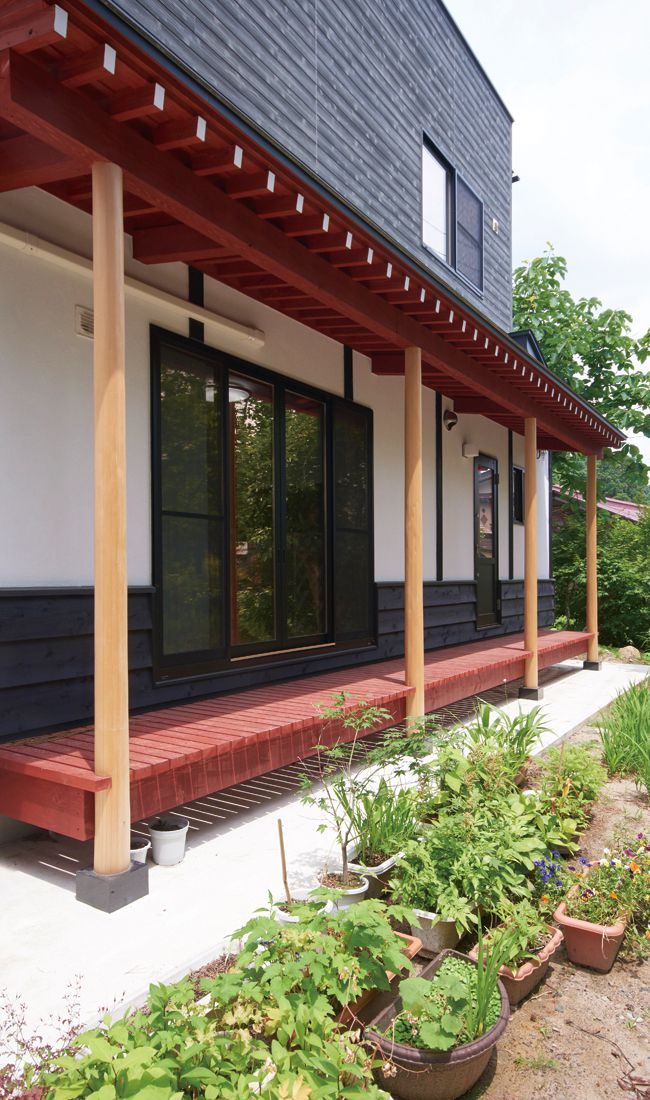そんな辻家だけに、家づくりもお寺中心。外観はお寺の本堂となじむよう、一部塗り壁と秋田杉の腰板を使うなどして工夫されている。1階部分はほぼお堂の延長のような形で、1階の納戸は住職たちが衣装替えをするためのスペースだし、広い土間には立派な秋田杉の式台が設置され、来客が気兼ねなく腰かけ、ちょっとした近況を言い言いして過ごせるようになっている。この土間には床暖房機能もあり、冬の間の融雪はもちろん、来客が寒い思いをしなくてもすむようにとの配慮がなされているのである。