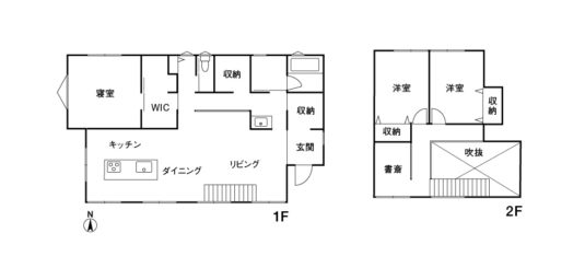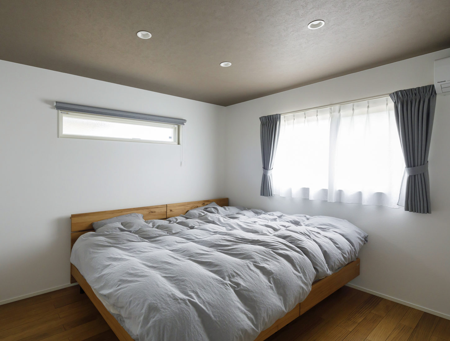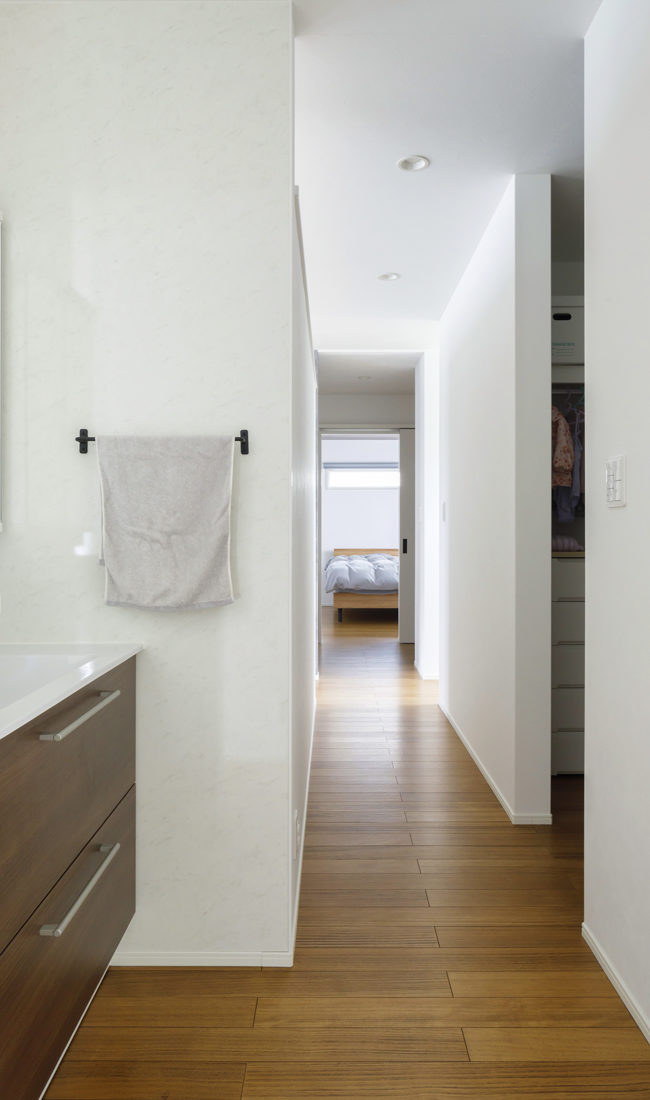 1 階に水回りと寝室を集約することで、実質的には平屋暮らしのようなスタイルを採用。玄関を上がると洗面スペースと浴室、