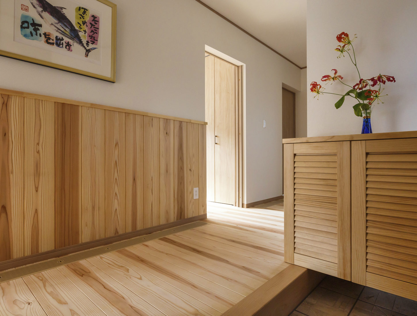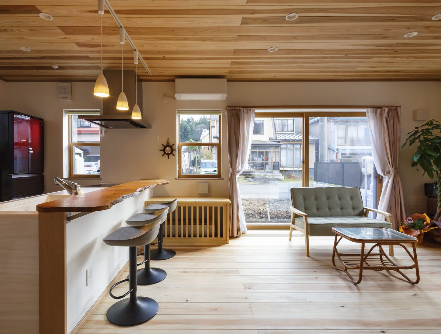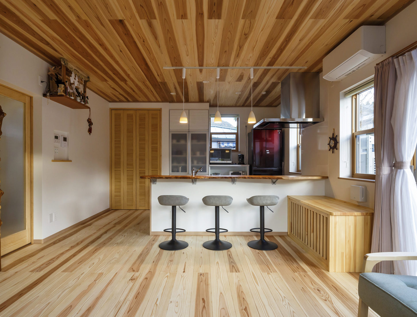 家族の希望で、旧住居で使っていた木材を積極的に再利用。年月を経て飴色に輝くケヤキのキッチンカウンターやエンジュの床柱は、新居でも変わらず家族を見守っている。LDKの床と天井には無垢の秋田スギをふんだんに使用。さらっとした足触りと木の香りが心地よく、白を基調とした温もりを感じる室内となっている。