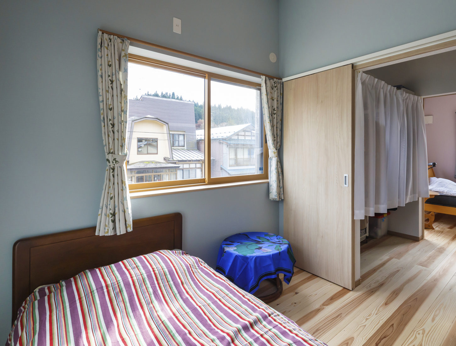 2階はウォークスルークローゼットを挟む形でKさん、長男の寝室がそれぞれ設けられている。収納を1カ所にまとめることで個室の面積を広げることができるため、勾配天井がもたらす開放感も相まってゆったりとした印象を感じさせる。