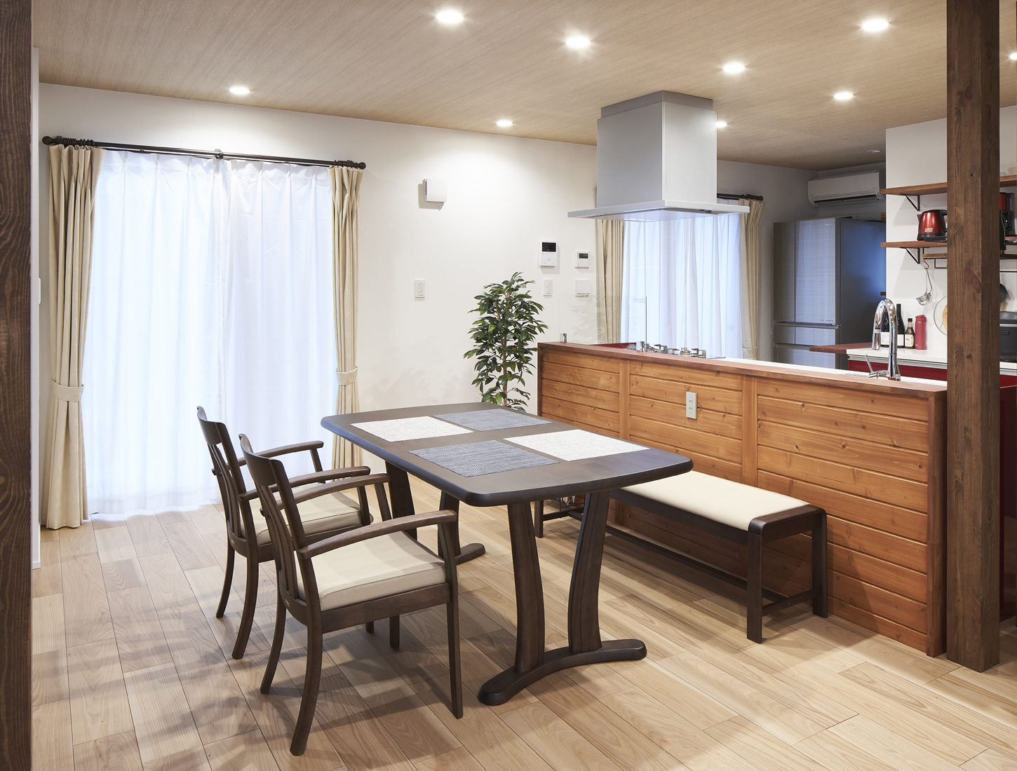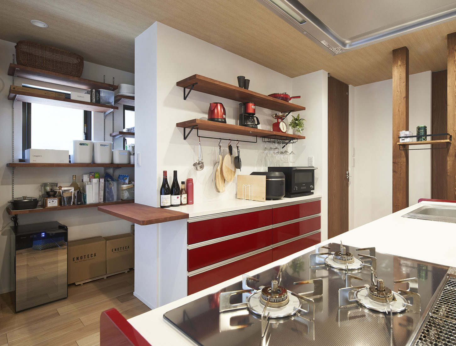 1階はあえてパントリーを半開放にするなどスペースを広く感じられる工夫がなされている。LDKの中心になっているのは、ライブキッチンを意識したアイランドキッチン。妻のSさんは「これまでは壁付けのキッチンだったので、新築するならテレビを見たり家族と会話したりできる対面式にしたかったんです」と話す。キッチン背面は基本カラーと合わせたスギ板張りに。「おかげで私もキッチンに立つ機会が増え、夫婦で食事づくりを楽しんでいます」とMさんは笑顔で口を揃えた。