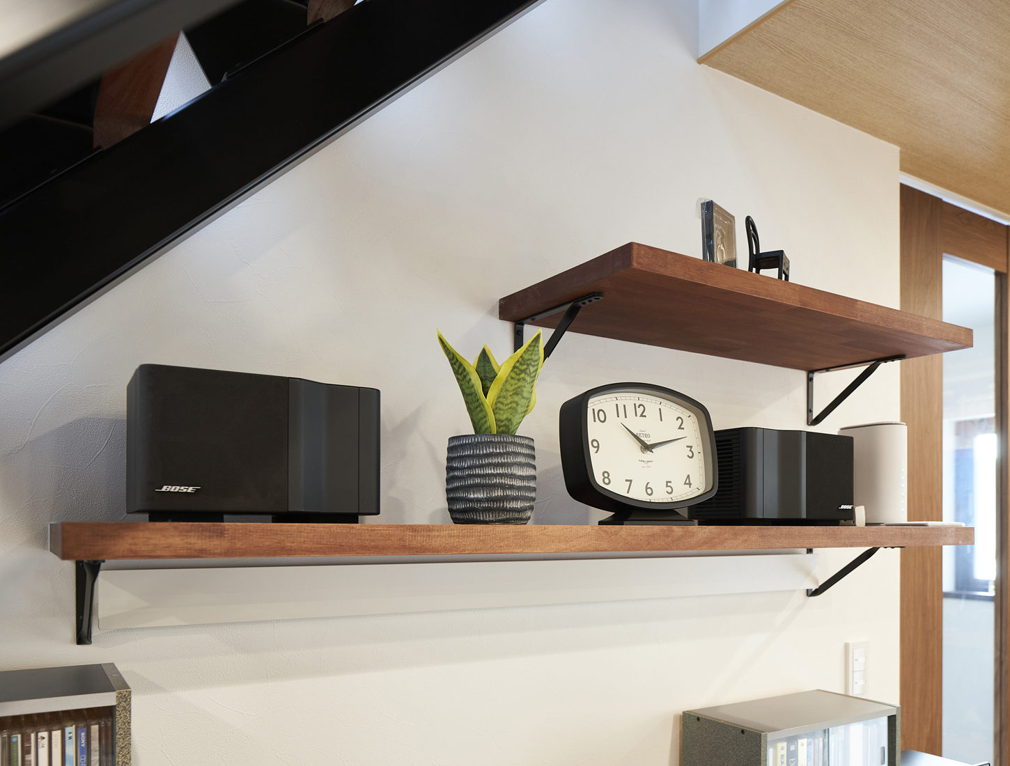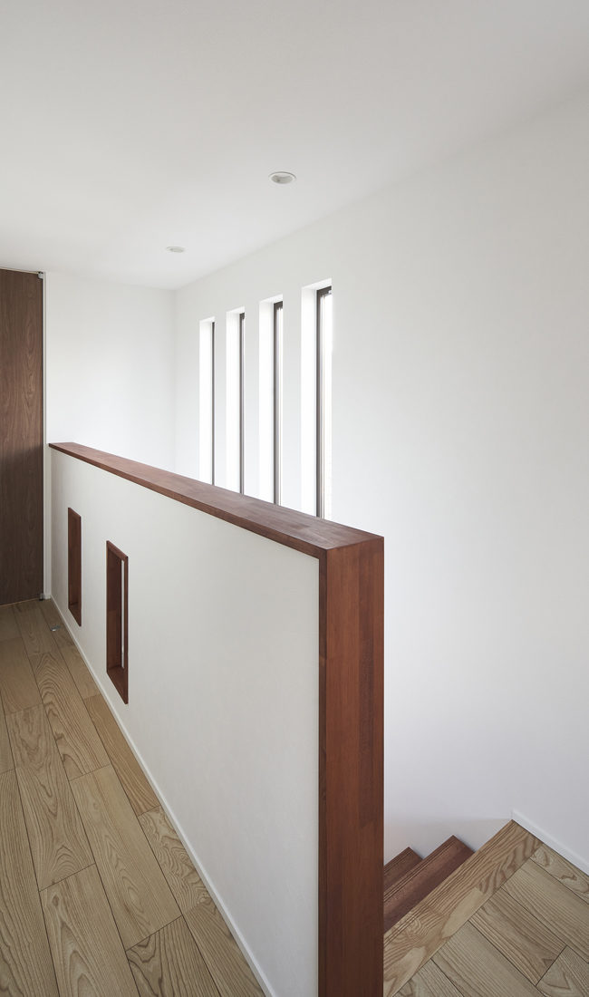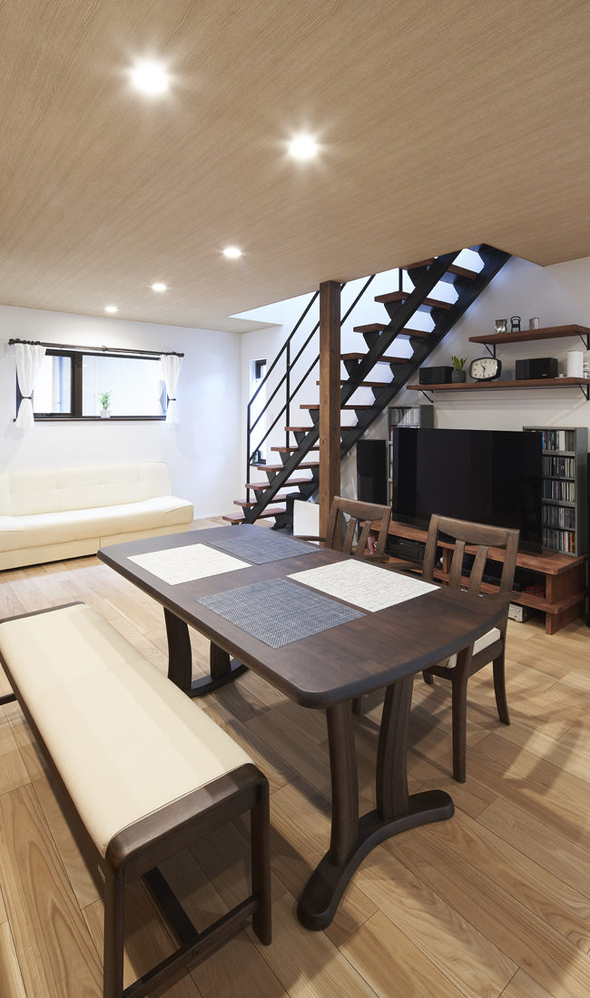 Mさんたちは同社のラインナップのうち、コンパクトな高性能住宅「Life Box」を気に入り、「長方形の総2階+玄関」の仕様をもとに、内部を自分たちに合わせた間取りにアレンジした。営業の高橋さんはMさんたちとの対話を重視し、要望と2人の暮らし方を聞き取ったうえで幾度にもわたりプランを提案。打ち合わせを重ねて細かいところを詰めていった。特に大切にしたのは内装の配色だったという。「赤みのあるダーク系」と基本カラーを決め、階段の踏み板や造作棚の色をぴったり合わせた。おかげで室内は、棚板一枚まで統一感のある仕上がりになっている。