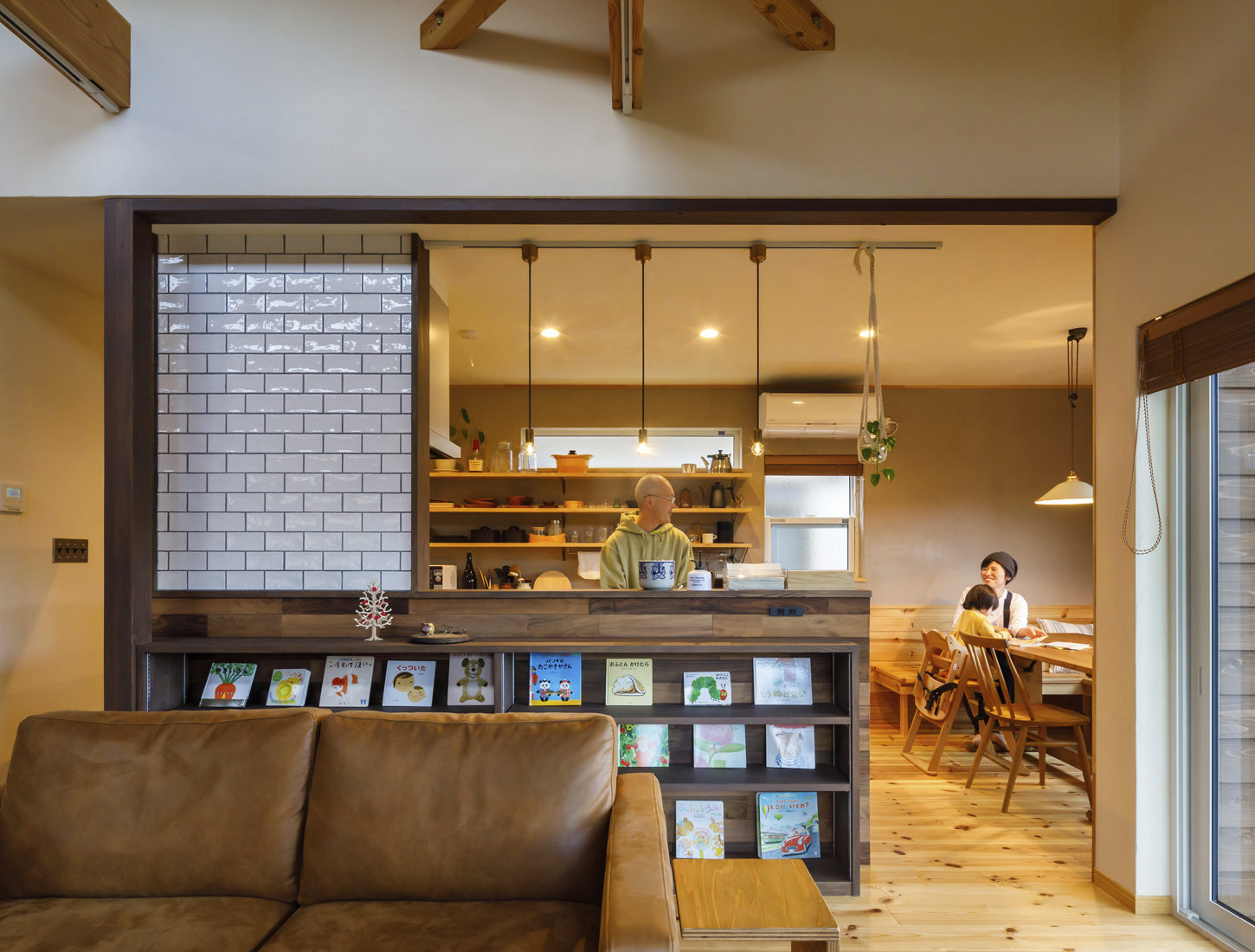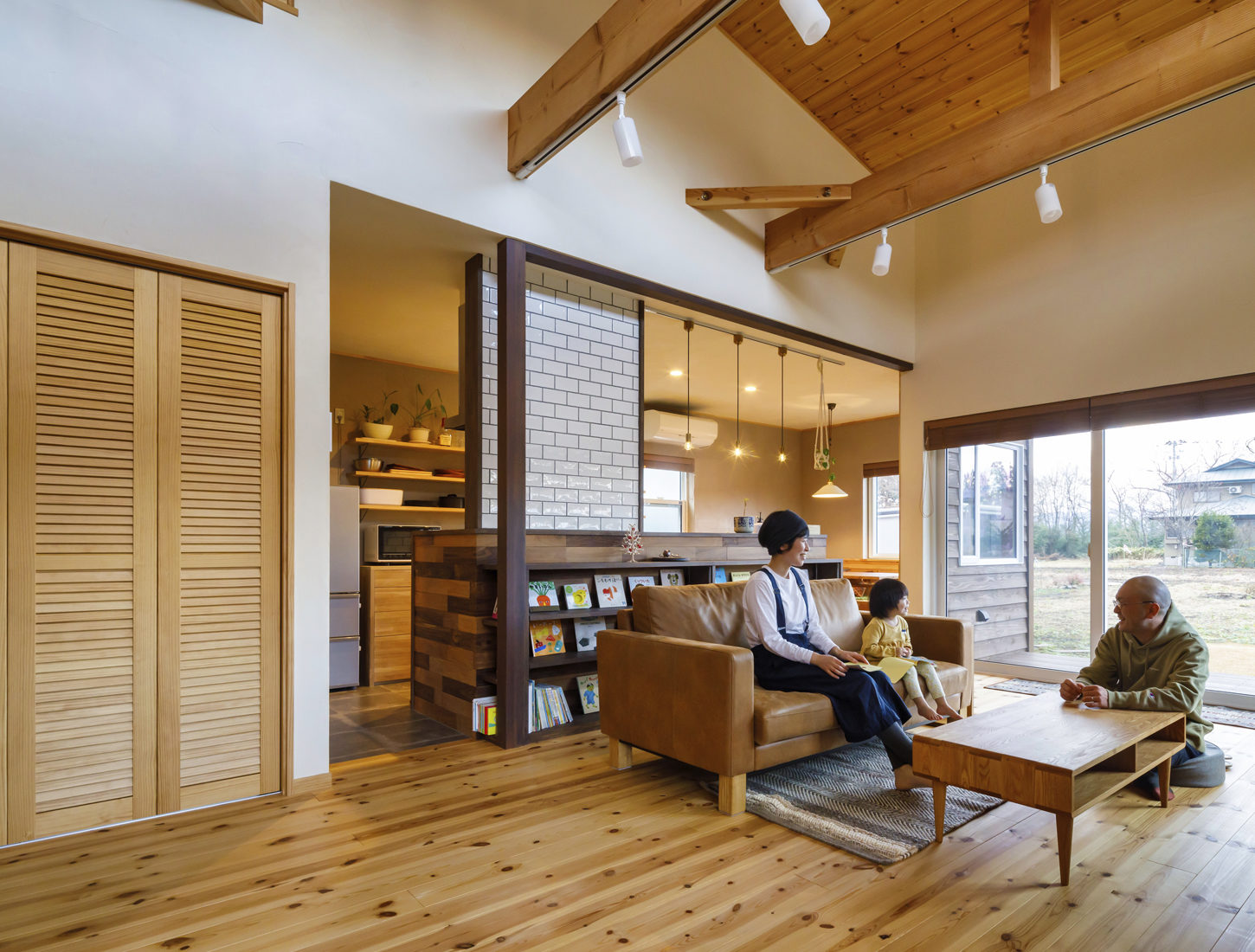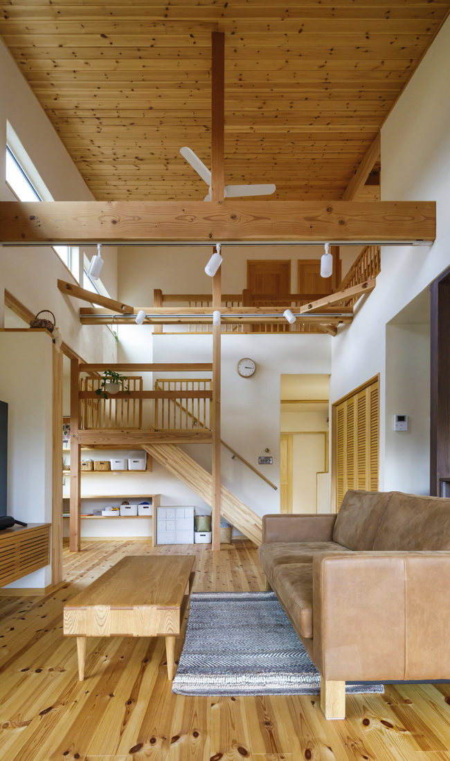 こうした希望に対するプリウッド工務店の提案は、勾配天井を生かした吹き抜けのある〝半分平屋〞の家だった。LDKや水回りに加えて、主寝室を1階に配置。こうした住まいを〝半分平屋〞としてプリウッド工務店の太田さんは「1階で基本的な暮らしが完結するため、ライフステージに変化が生じても暮らしやすさは変わりません。さらに2階は勾配を利用したフリースペースも設けられますし、子ども部屋が必要な期間は独立した個室として、必要がなくなったら広い一部屋として自由に使うこともできます」と解説する。そして「北向きでありながら明るいリビング」は、リビングの掃き出し窓と、吹き抜け上部の高窓により常にほどよい明るさを実現。吹き抜けは明るさのほかに、開放感やどこにいても家族とのつながりを感じられる安心感にも一役買っている。新居に住み始めてから1年ほどになるが、「プリウッド工務店は断熱性が高いこともあって、リビングが北向きでも寒くない。夏場は思ったとおり涼しく感じましたね」とMさん。妻のHさんも「平屋暮らしができる間取りや、細かに要望をくみ取ってくれた造作の建具や家具、そして冬でも裸足で過ごせる自然素材の家の良さを実感しています」と満足げ。最後に「〝家づくりは楽しいもの〞と感じさせてくれた太田さんには感謝しています」と夫妻でほほ笑んだ。