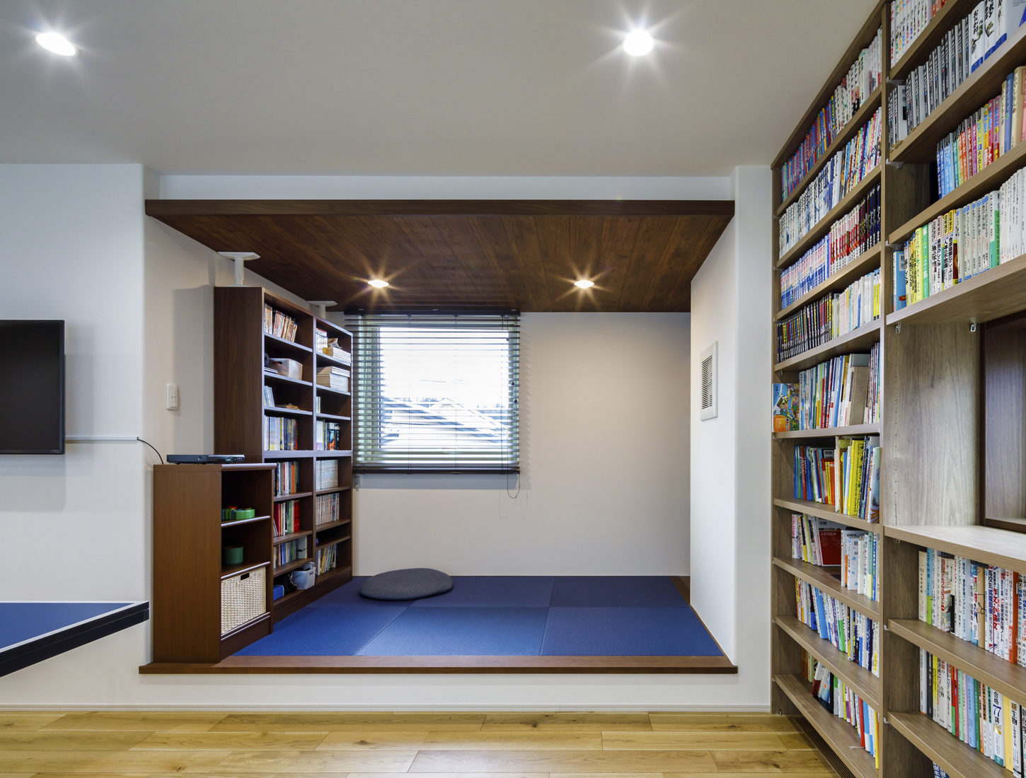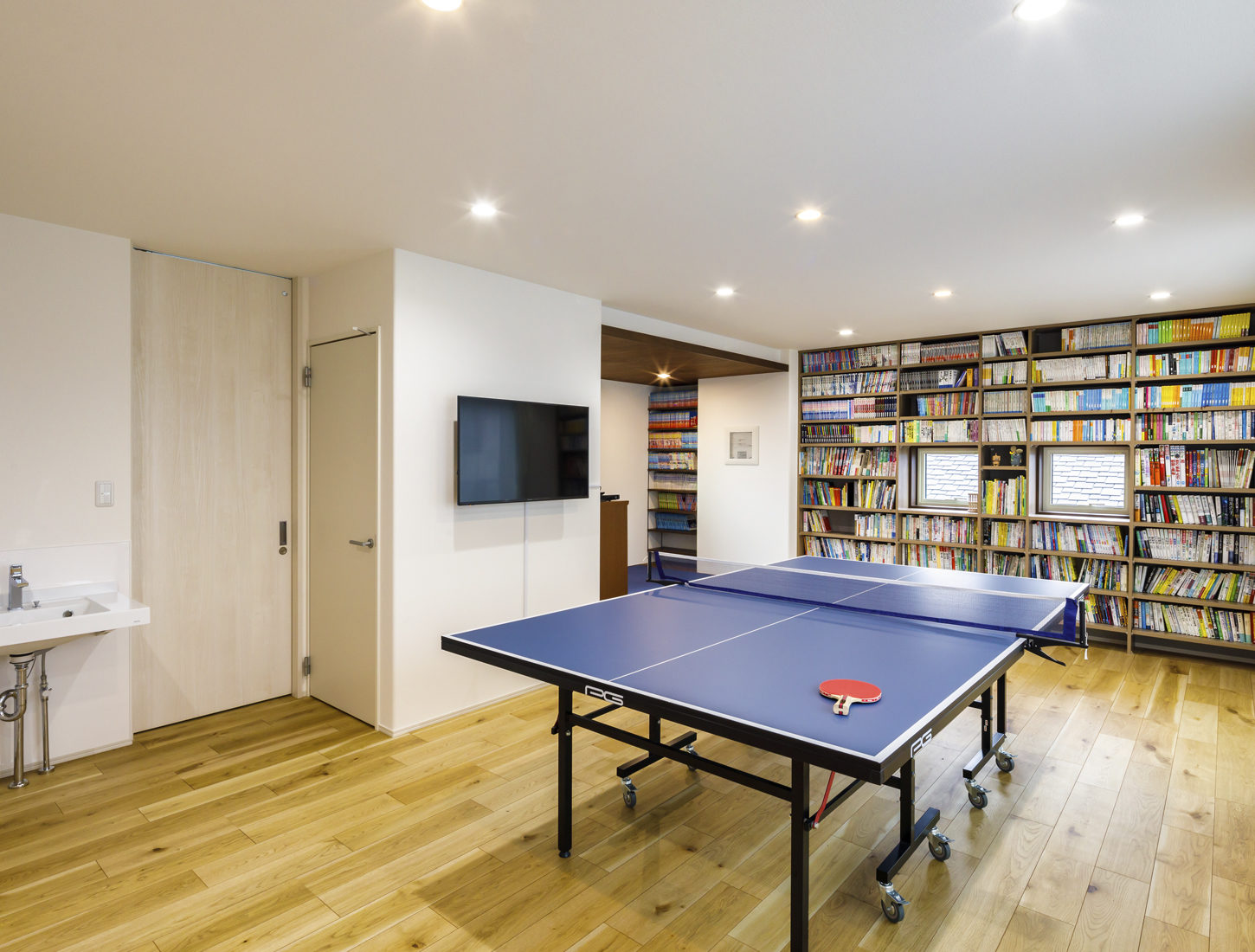 2階には、S邸のオリジナリティとも言えるフリースペースに家で遊べる家族の楽しみとして卓球台を設置した。さらに、本好きの夫妻の蔵書を納めるため、壁一面に本棚を設えた。「卓球はもちろん、本やマンガを読んだり、これから増えてくるだろう子どもや私たちの趣味だったりを楽しむ場所。一部を小上がりの畳にして、腰をかけたり、寝転がったりしながら快適に使っています」と遊び場のある暮らしを楽しんでいるようだ。