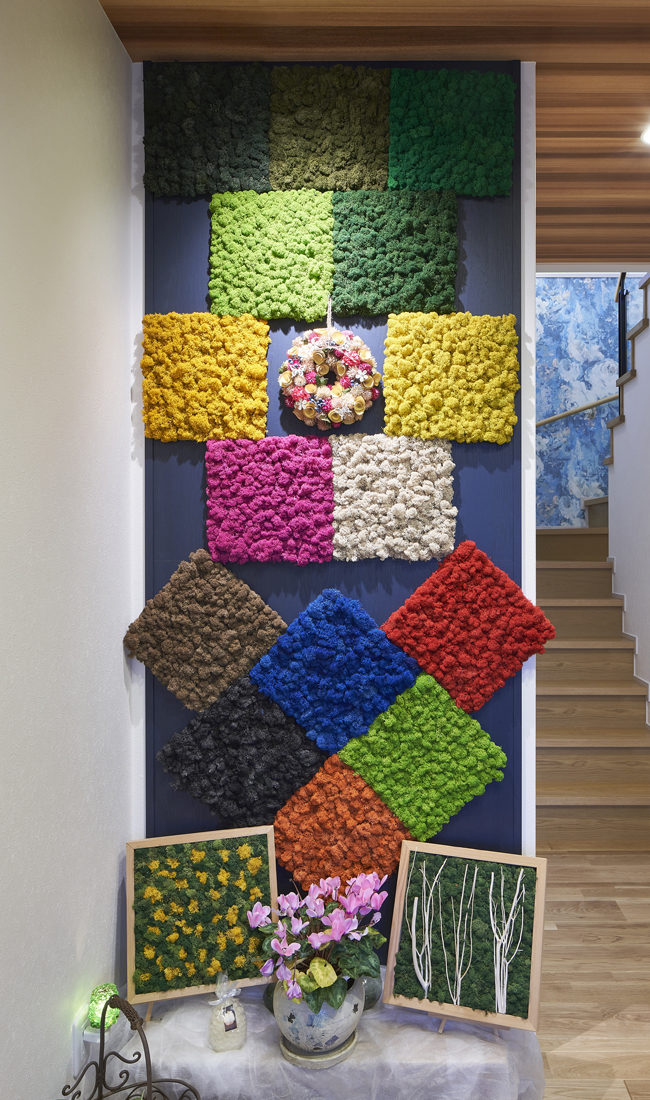 「制作に打ち込める環境がほしい」という思いを、Rさんは長年あたためてきた。子育てと親の介護に区切りがついたのを機に人生の第二ステージを始めたいと、自宅の建て替えを決意したという。北欧産のコケを使った装飾品「モスアート」の作家として活動するRさんは1階をアトリエ、2階を居住スペースとする職住一体の住まいを完成させた。