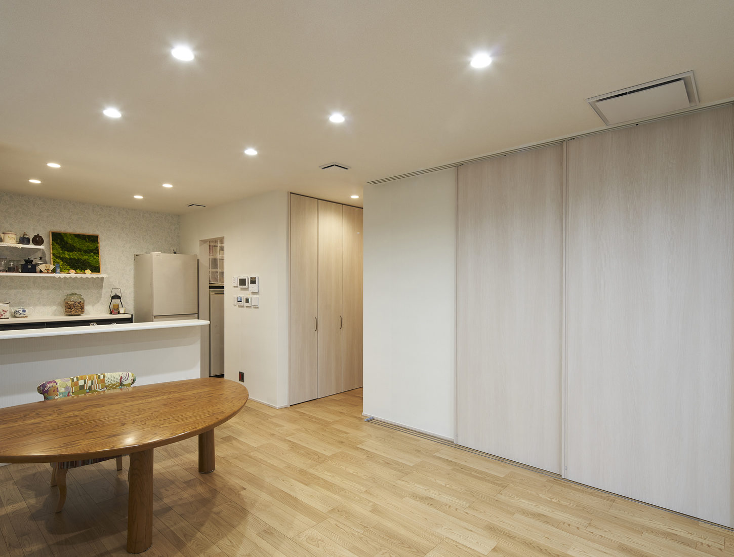 2階は完全にプライベート空間とし、Rさんの居住スペースはLDKと寝室が隣接するワンルーム型。「壁紙、収納の配置など細かいところにまで好みのものを選ぶことができました」とRさんは満足そうに話した。 介護を経験したRさんは、将来を考えると居住スペースは1階がいいと思っていた。そこで出した解決策が階にも住めるように設備を整えておくことだった。必要になったら浴室などを作れるよう、スペースや排水設備がある。上下階にキッチンがあるのも将来を考えてのことだ。「いざとなったら生活の場を1階に移し、2世帯住宅として住むこともできます」と、自宅で暮らし続けられる安心感も手に入れた様子だ。