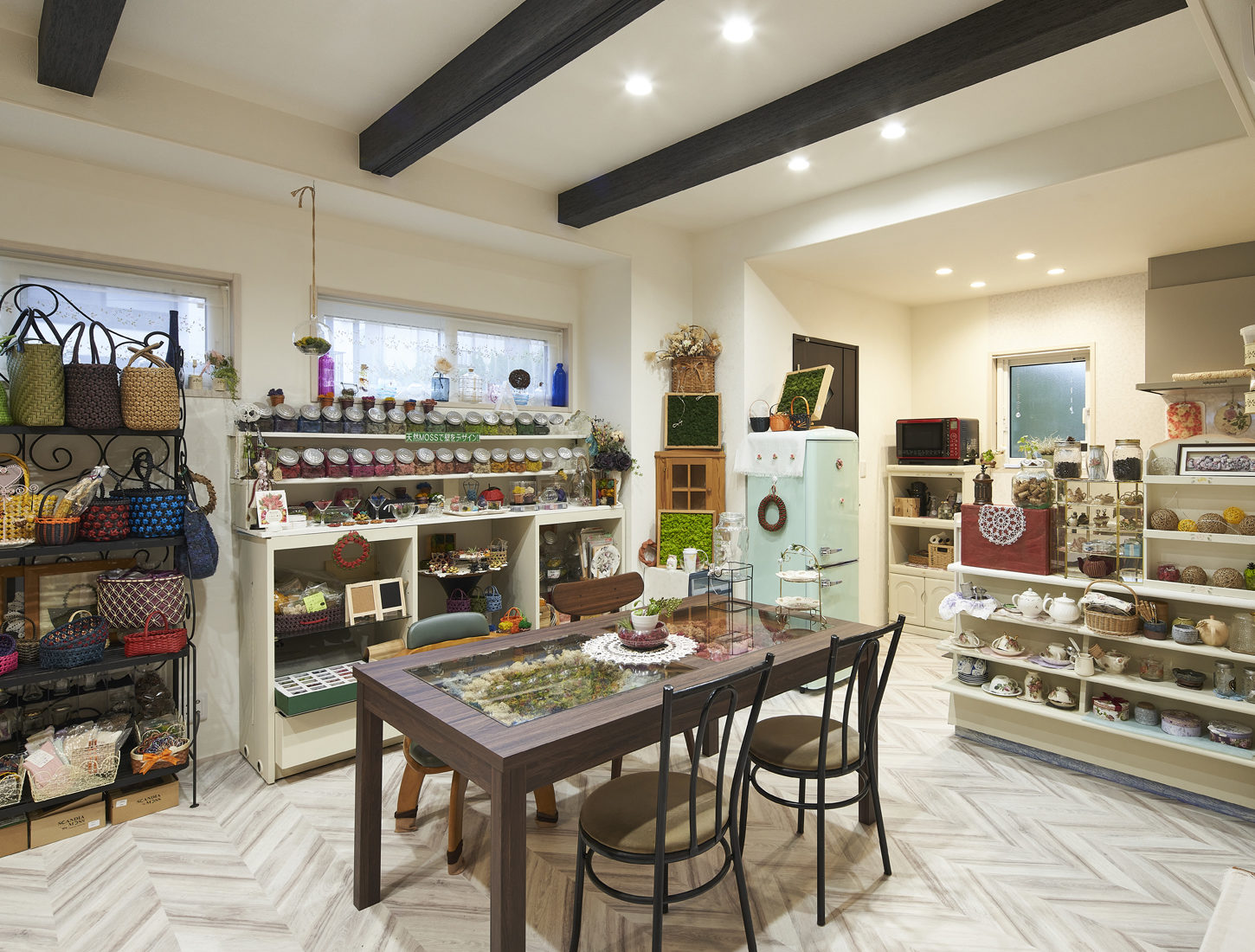Rさん自慢のアトリエが1階の大部分を占める。大きな壁面にはさまざまな作品やコレクションをまとめてディスプレイされている。アトリエの中央には自作のモスアートを配した特注のテーブル。すぐ取り出せるよう材料や道具類は壁面の棚に収めた。「地域の人が気軽に訪れて、わいわいと過ごせるスペースにしたかったんです。作り方をいわゆる住み開きというやつですね」とRさん。アトリエにはキッチンも備えており、友人が訪れて一緒に食事を作ってて楽しむこともあるという。