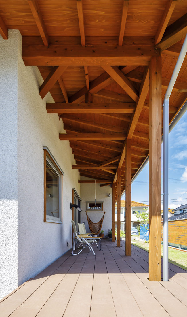 リビングの掃き出し窓からつながるウッドデッキには大きな軒を新設。夏の日射を遮り、雨の日でも使えるセカンドリビングのようなスペースができあがった。家じゅうの窓は断熱性の高い窓に入れ替えた。「カーテンを開けても暑くないし、夫がDIYしたウッドデッキも活躍の機会が増えて、コーヒーを飲んだりくつろいだり、快適です」とRさん。温熱環境が劇的に変わり、鳥海山も見渡せて立地の良さを楽しめるようになったという。また、外壁もサイディングから塗り壁に一新。木をはじめとした自然素材にこだわった家に一変した。