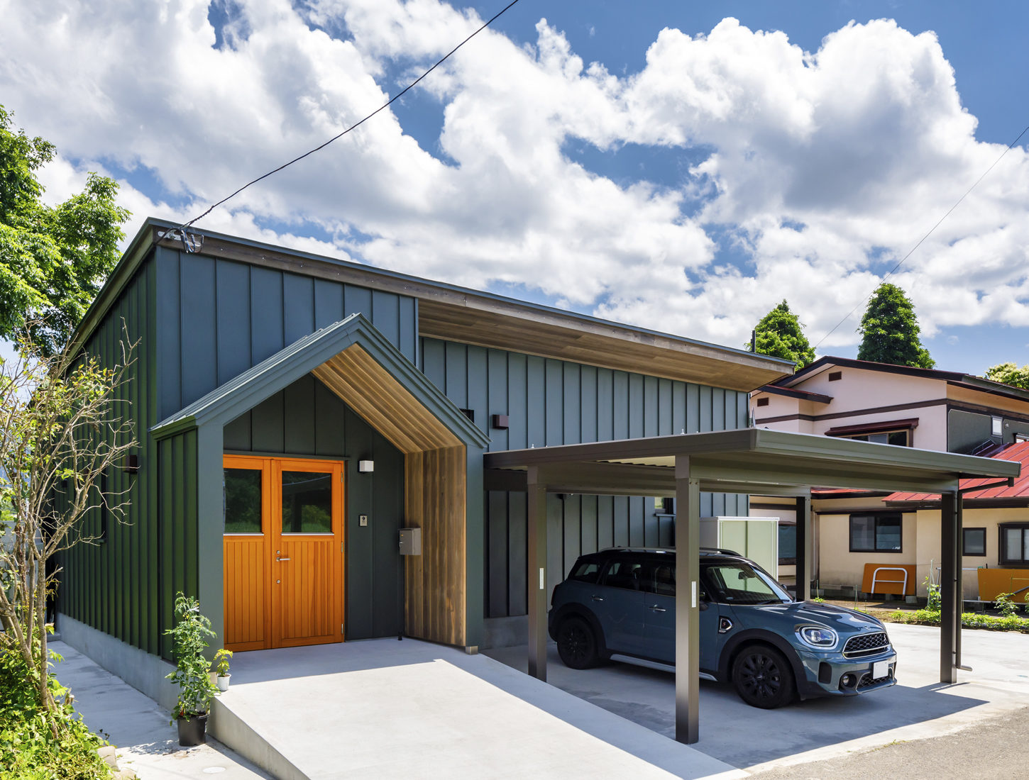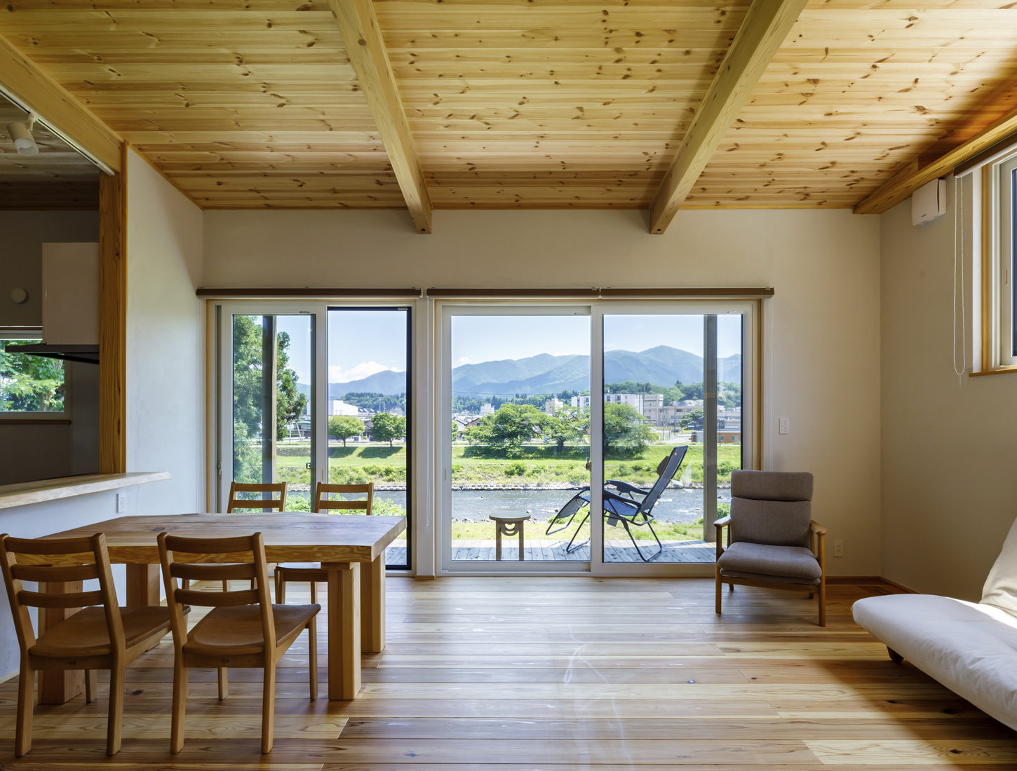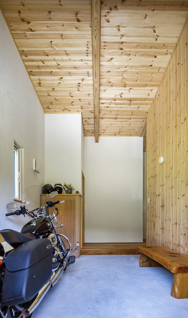 O邸の特徴は何と言ってもその立地。米代川沿いの、春には桜並木を望む自然豊かな借景を暮らしに取り込むため、米代川に向かって掃き出しの大窓を配置、軒のあるウッドデッキも設えた。さらに、共通の趣味であるバイクのために、玄関土間は大型バイクを収納できる広さにし、出入りしやすい両開きの玄関ドアを設えた。池田建築店の提案だったという玄関ポーチは切妻型の形と内側に張られた秋田スギがアクセントになっている。