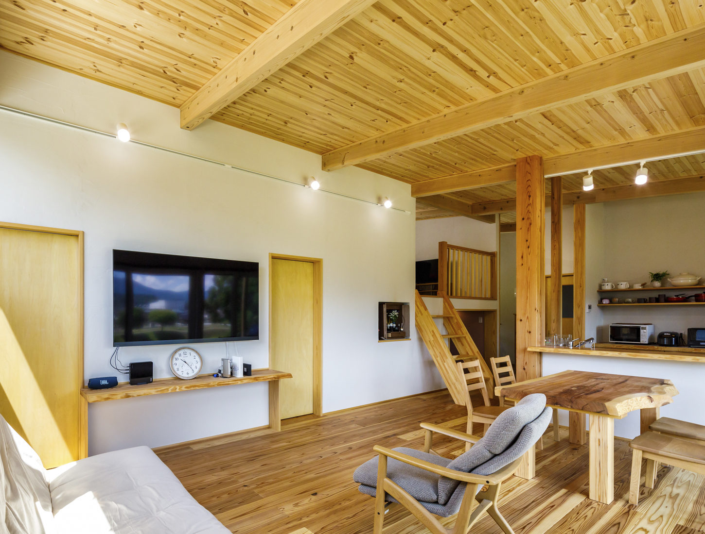 夫妻の希望は、まずは念願だった木をふんだんに使うこと。床と天井は秋田スギの無垢材に。特に床は30 ミリの秋田スギが柔らかく、夏はさらりとしながら、冬はほのかに温かいという。さらに、キッチンのカウンターやテレビカウンターには一枚板の秋田スギを採用。秋田スギの木目と珪藻土の塗り壁のバランスも良く、夫妻の希望どおりの仕上がりだという。