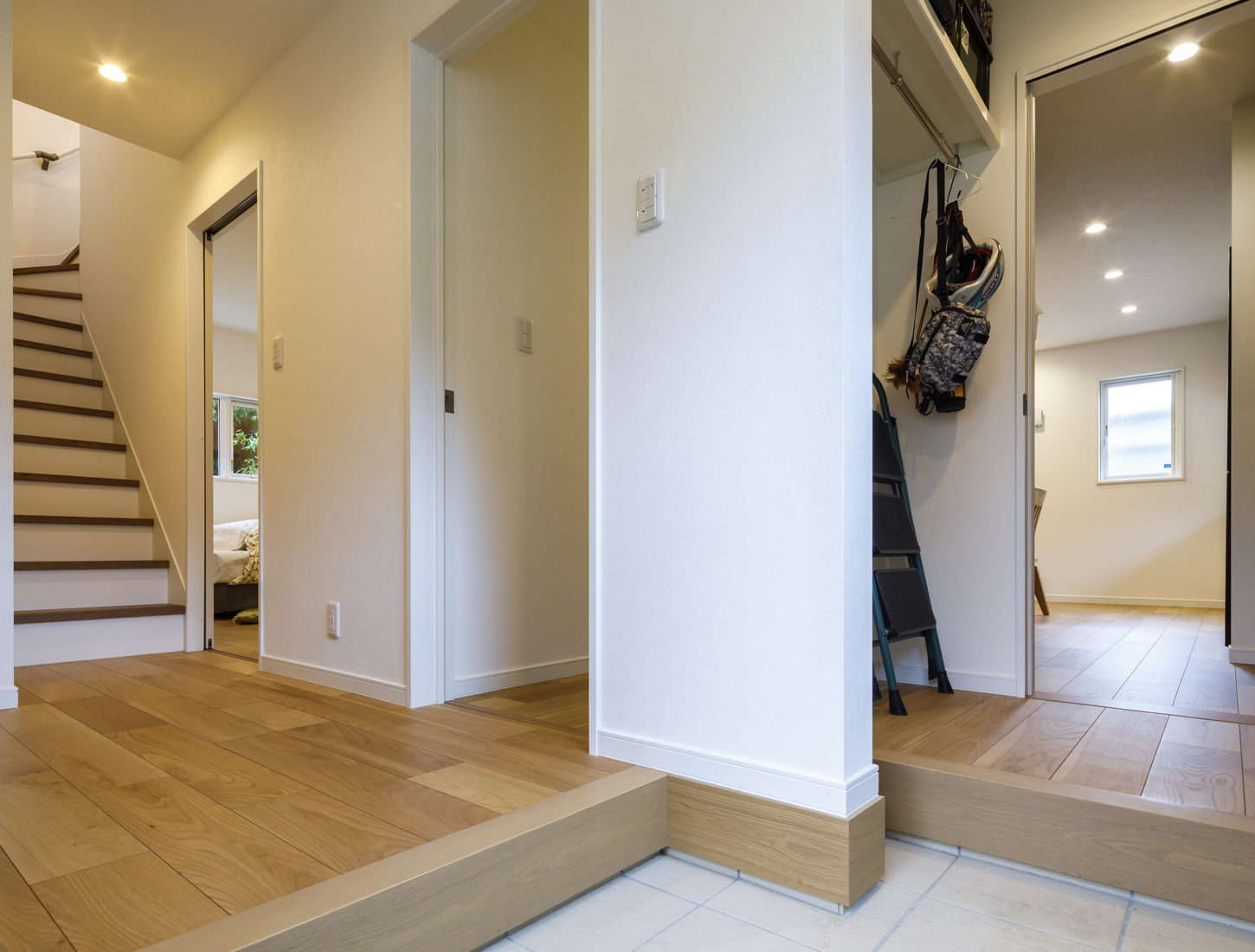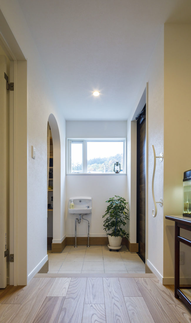 内覧会で訪れた物件などを参考に、妻のAさんは玄関からシューズクローク、パントリー、キッチンへと直線でつながる動線を希望。また、並行する廊下との間に仕切り壁を設け、玄関からの動線を来客用と家族用に分けてバックヤードが見えないようにした。