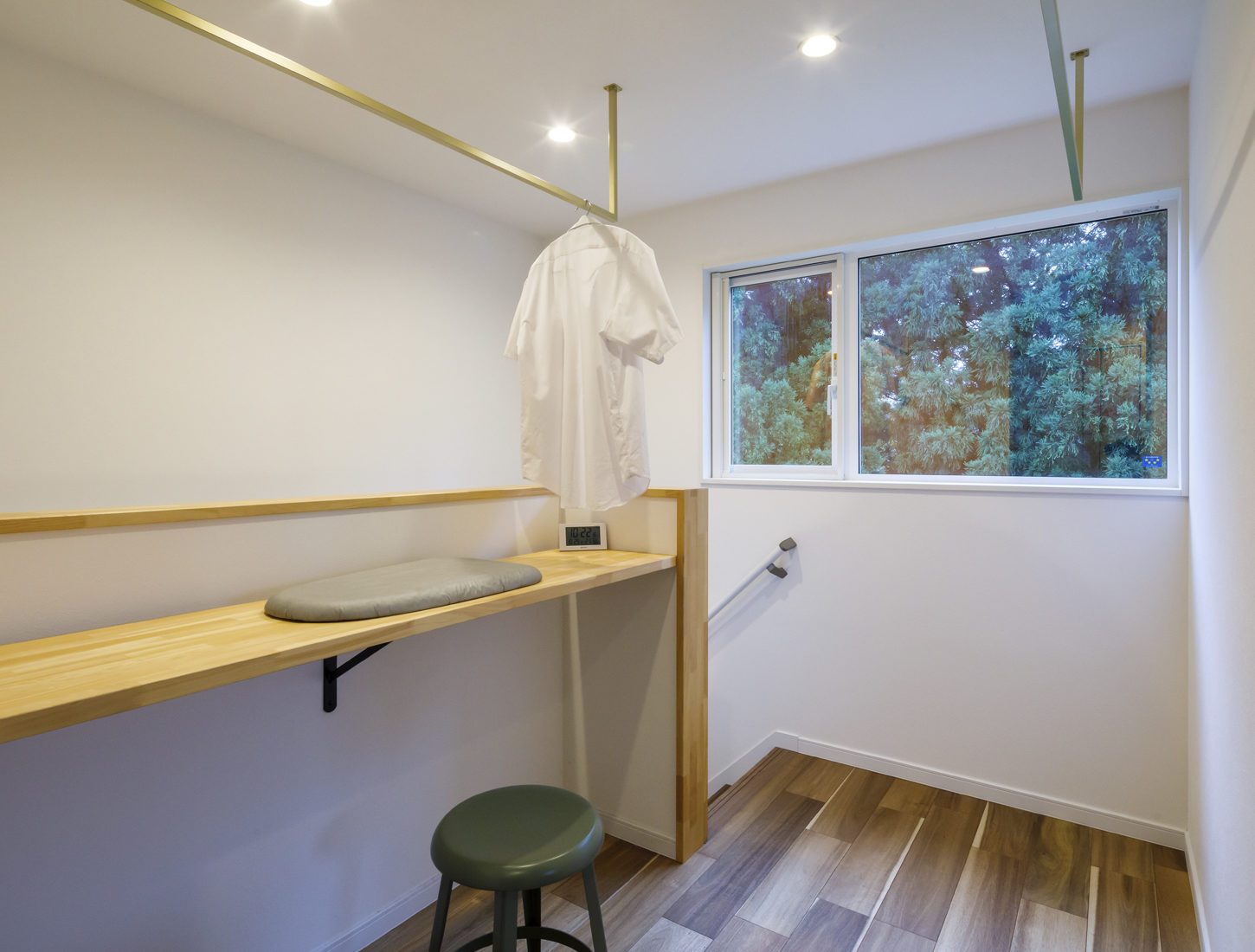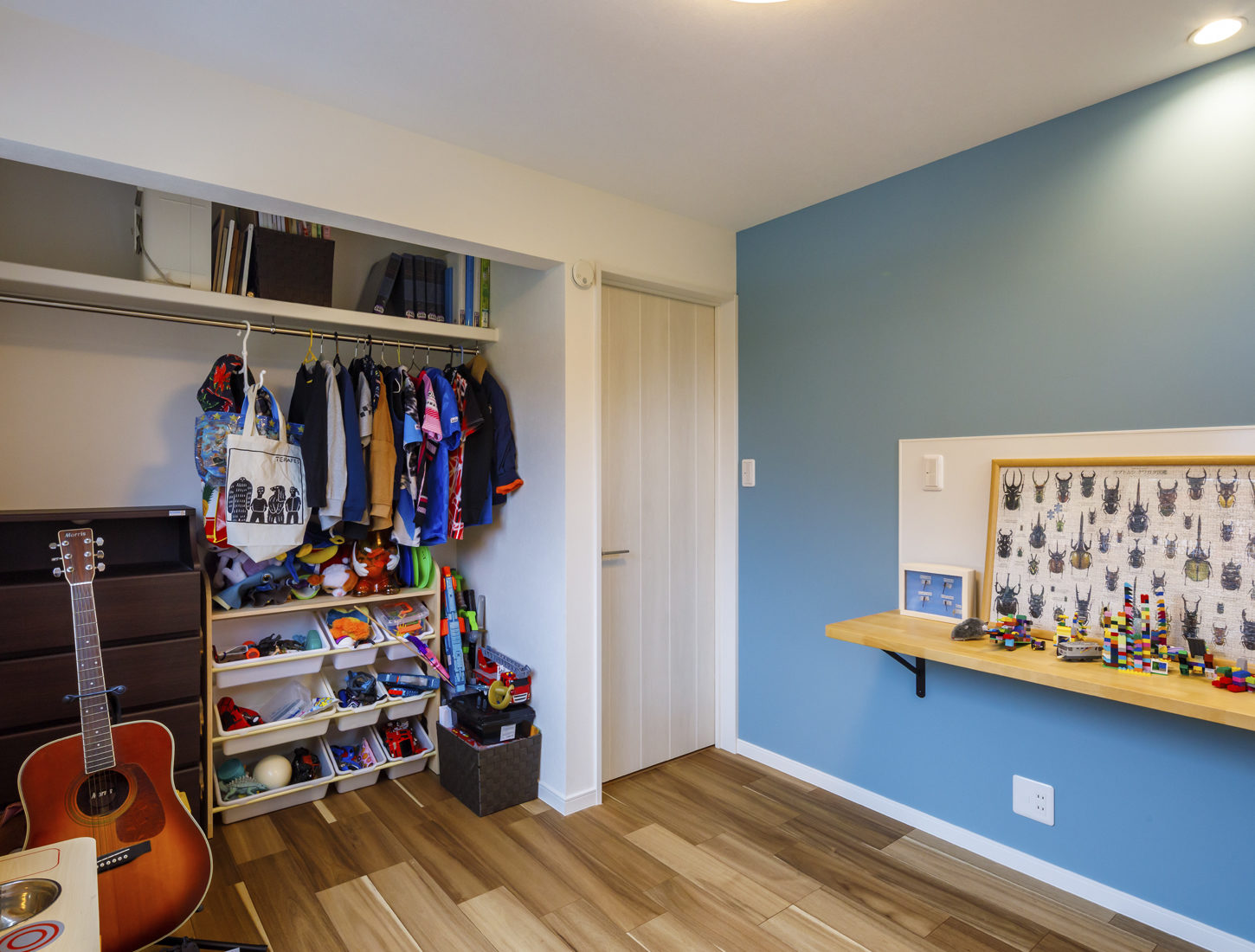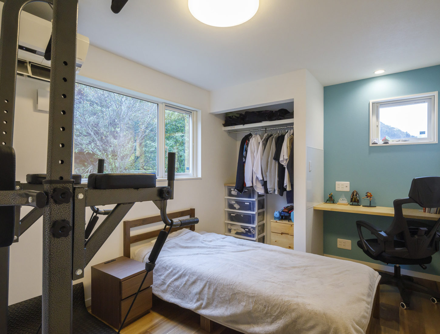 LDKに隣接する祖母の部屋は1階の中心にあり、玄関や浴室、キッチンなど生活に必要なエリアへ容易にアクセスできる。祖母の部屋を開放すると大勢の来客にも対応可能だ。車いすにも対応できるよう、通路の幅を広く取り一階のドアの多くを引き戸にした。Hさん夫妻の希望もあり延べ床面積が約33坪と5人家族にはコンパクトながら、家族それぞれのスペースもしっかり確保できている。