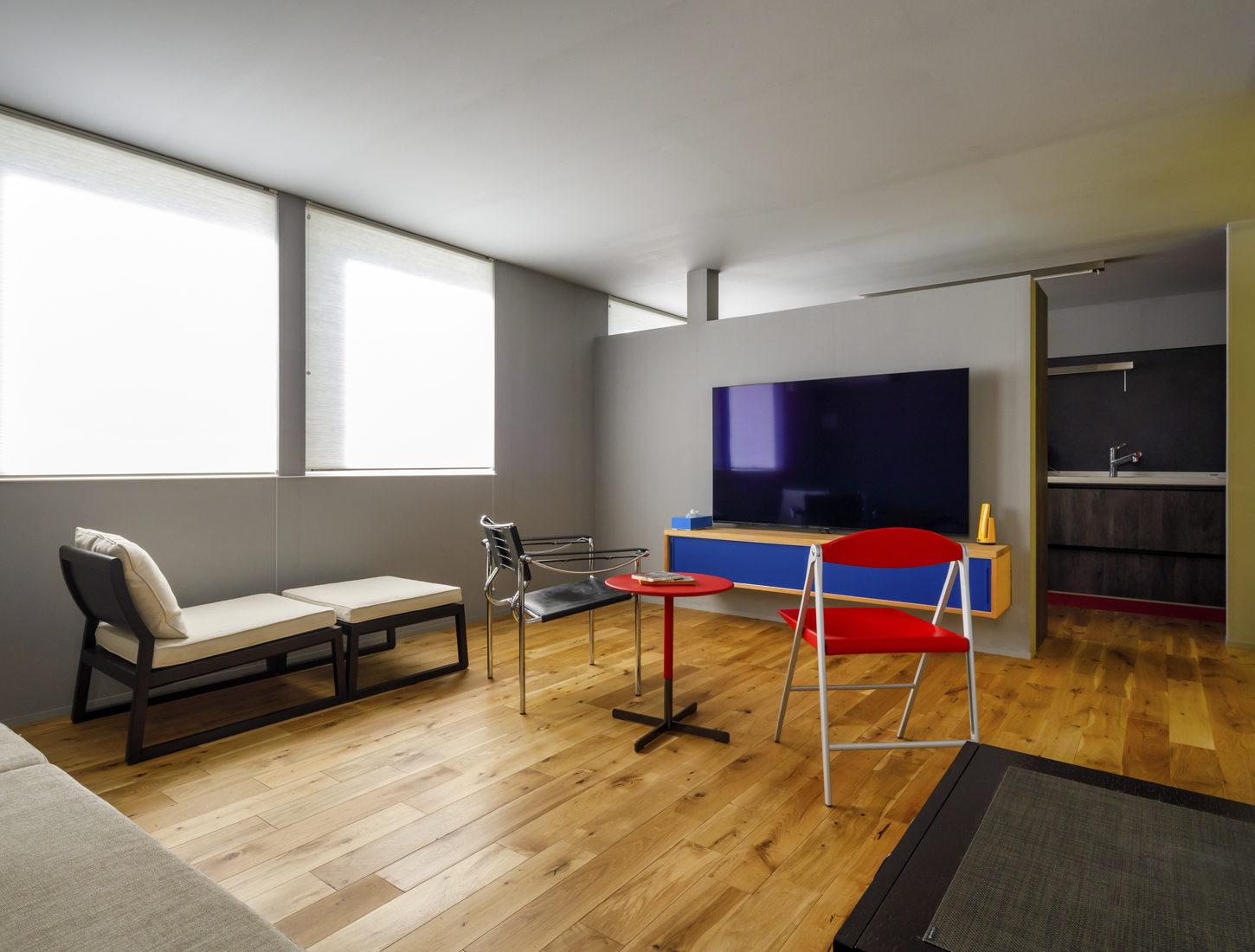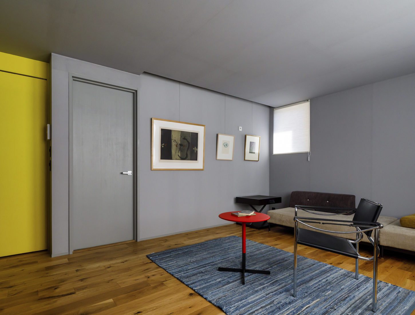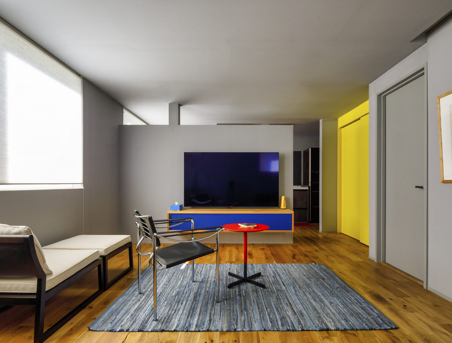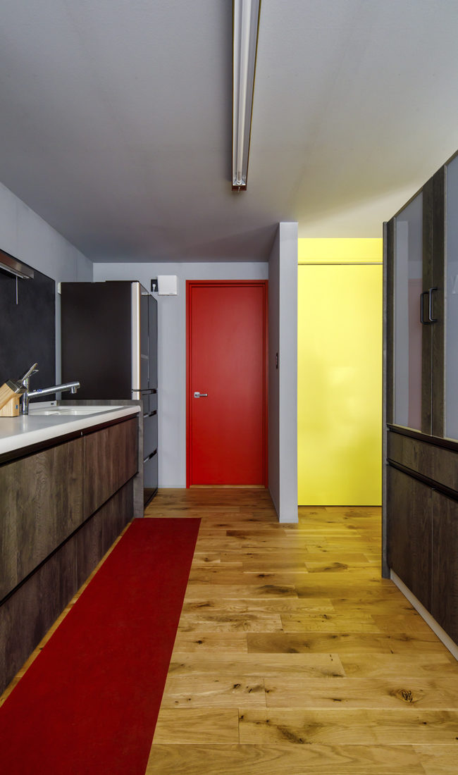今回の改修は、個室だったスペースを家族の主な居住空間となるLDKに改修する計画だった。Sさんはアートと家具のコレクターでもある。改修に際してSさんは「好きなものだけ置いた空間に」をコンセプトにした。長い時間を過ごすLDKこそ、お気に入りのコレクションを眺めるのぴったりだと色彩を操り、家具とアートを楽しむモダニズムを追求したLDK考えたのだ。絵画が映えるよう、室内は紙クロスにグレーの顔料を塗り、極力シンプルに。一方でドアや造作家具など一部に、ドイツ・バウハウスのデザインを参考に、赤、イエロー、ブルーを大胆に配した。壁面にはピクチャーレールを通し、長年かけて集めてきたイタリアンモダンデザインの家具を配置。目の覚めるようなモダンな空間ができあがった。