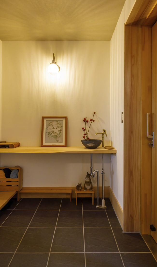 妻のNさんは建築士の資格と大工の経験があり、古民家再生などの仕事をしている。自邸については、基本設計からインテリアデザインに加え、大工とともに木材の加工に携わったという。「この家の気に入っているところは?」と尋ねたところ、「内壁の漆喰はすべて二人で塗りました。とにかく自分たちでやりたかったので」とFさん夫婦は笑顔で語った。