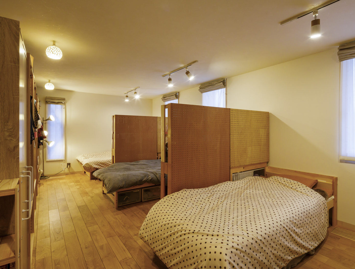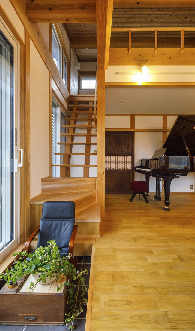 グランドピアノがゆったり収まる吹き抜けのLDKは、無垢のクリ材の床とスギ張りの天井という木の温もりあふれる空間。さらに、削り跡が見える現しの梁や、古建具など、新しいものと古いものが違和感なくなじんでいる。また、造り付けの収納が少ないことも大きな特徴。「ライフステージに応じて使いやすいように固定の家具などは極力減らして、必要なときに必要なものを作れればと考えました」とNさん。キッチン収納や子ども部屋の間仕切り収納などのほとんどを、大工の経験もあるNさんを中心に夫婦自らDIYで整えたというから驚きである。