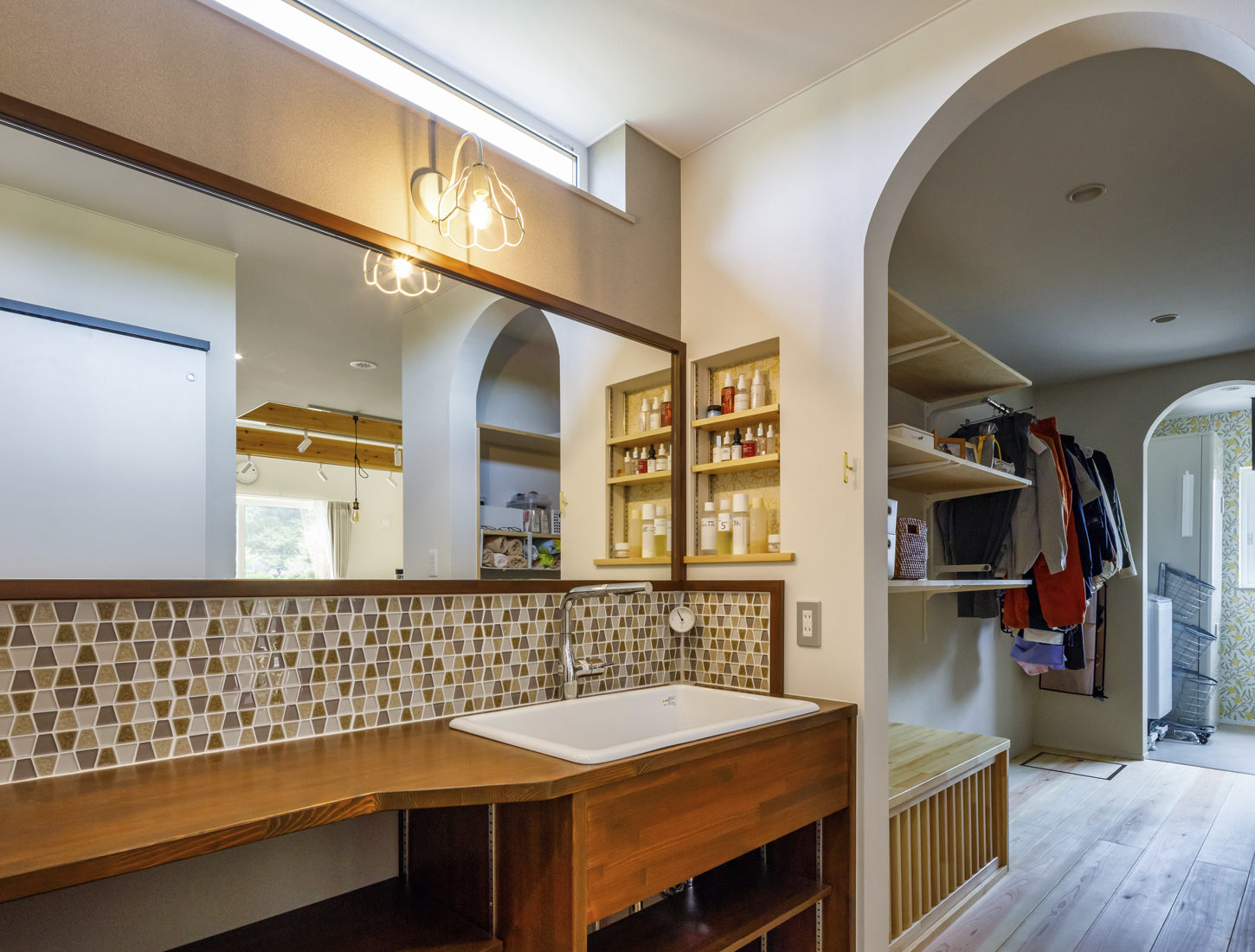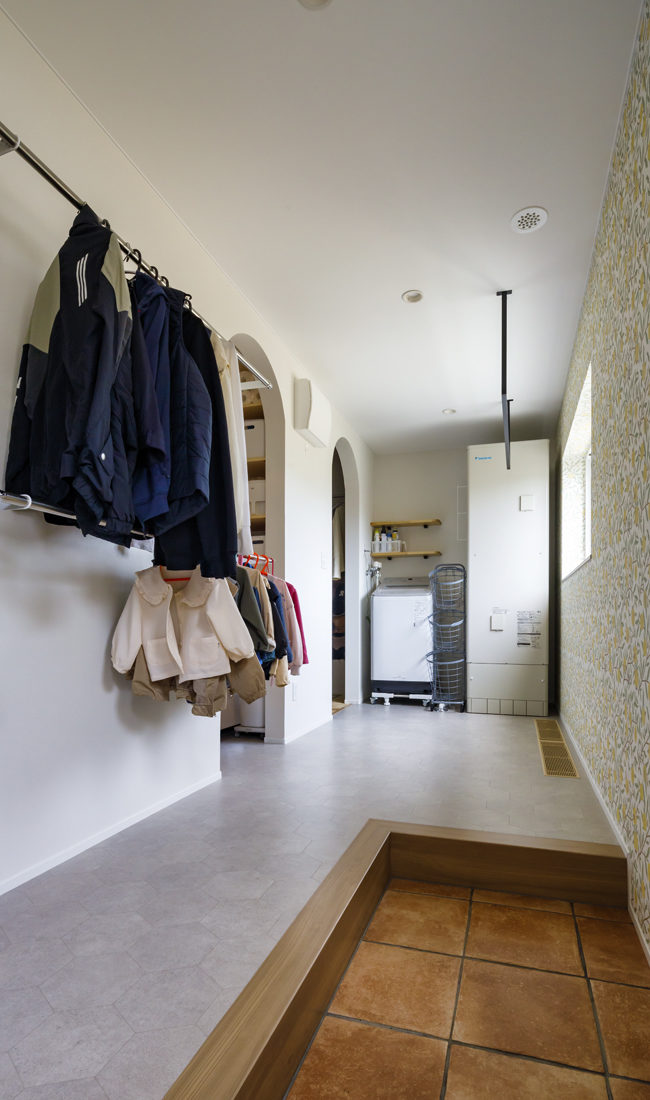 対して部屋数が合わなくなってしまって。新居を建てるなら子育てに利便性が高い平屋がいいかなと思ったんです」とHさん。廊下は極力なくし、かわりにユーティリティーを配置。キッチンとファミリークローゼットを並列にし、シューズクロークからランドリー、水回りなどをつなげることで効率性を高めている。