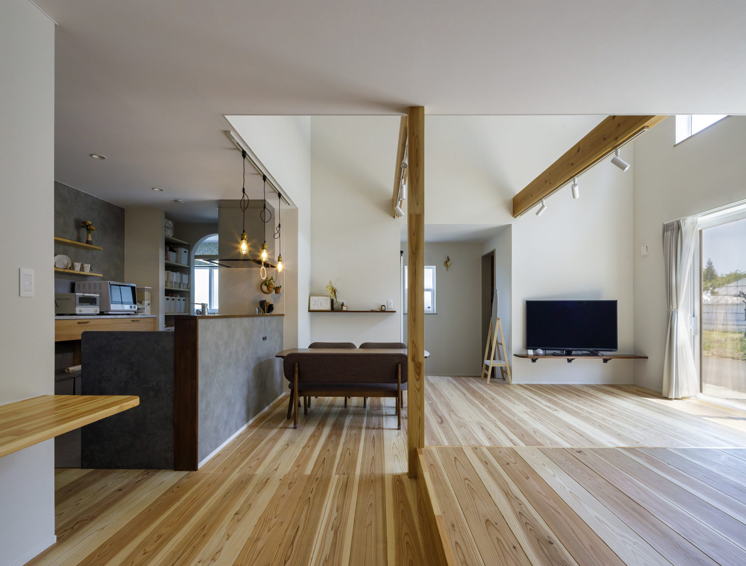 片流れの平屋は、高いところで天井高5メートル近くある。16帖のリビング、6帖の小上がりがある広々としたLDKでは天窓からもたらされる光で日中は常に明るく、秋田スギの木目が空間に温もりを感じさせる。暖かさを重視した設計と北欧風のデザインを融合させた住まいである。
