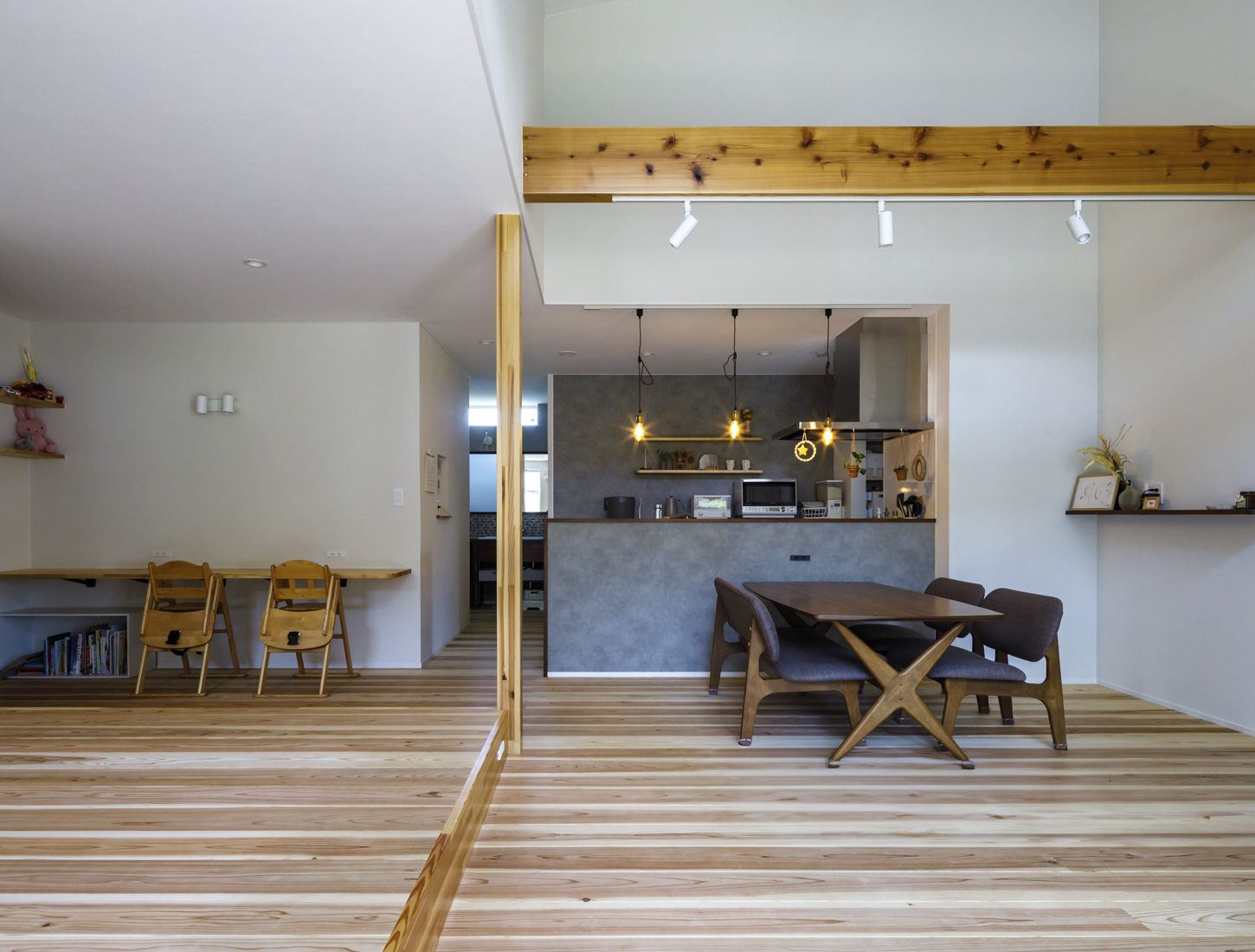 「回遊動線を設けたことで、子どもたちが家の中で追いかけっこしています。子どもたちものびのびできて、私たちもどこにいても子どもたちの様子に目を配ることができるので、安心して過ごせますね」とKさん。Hさんも「重視していた住宅性能は冬に実感しました。家じゅうどこでも暖かくて、扇建設さんにお願いしてよかったと思いました」と笑顔を見せるのだった。