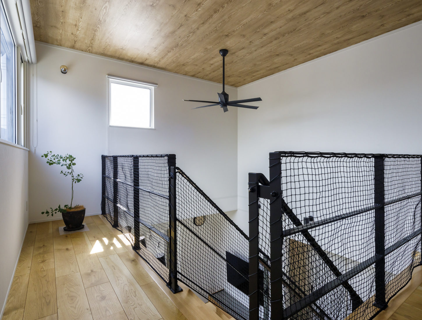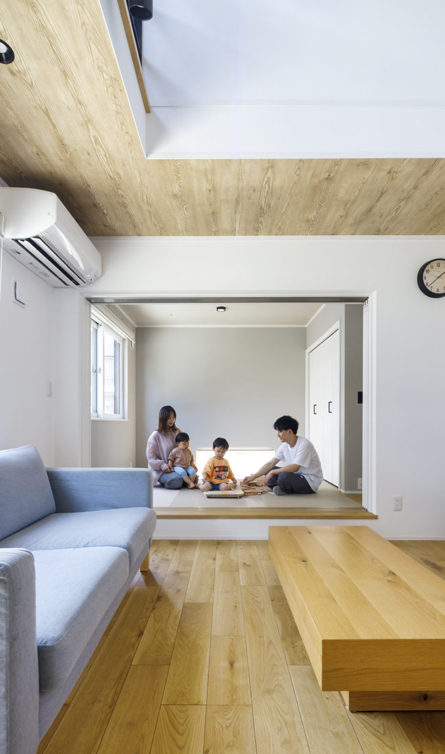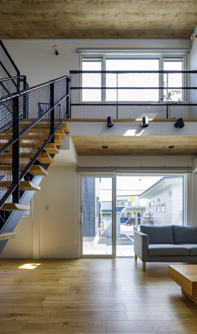 プランニングでは、開放感と明るさを追求した。U邸の敷地は間口よりも奥行きが深いため、暗くならないようにと大胆な吹き抜けにスケルトン階段を採用。そのため「寒くならないように性能は重視しました」とUさんは振り返る。運良く秋田ホームのキャンペーンにも当選したことからトリプルサッシを導入。「これまで2度冬を越しましたが、厳冬期も暖かくて快適です」とUさん夫妻は笑顔を見せる。細長い敷地を生かし、洋風畳の和室、LDKをI型にレイアウト。家のどこにいても家族の気配を感じながら生活できることに、Uさん夫妻は安心感と喜びを感じているという。