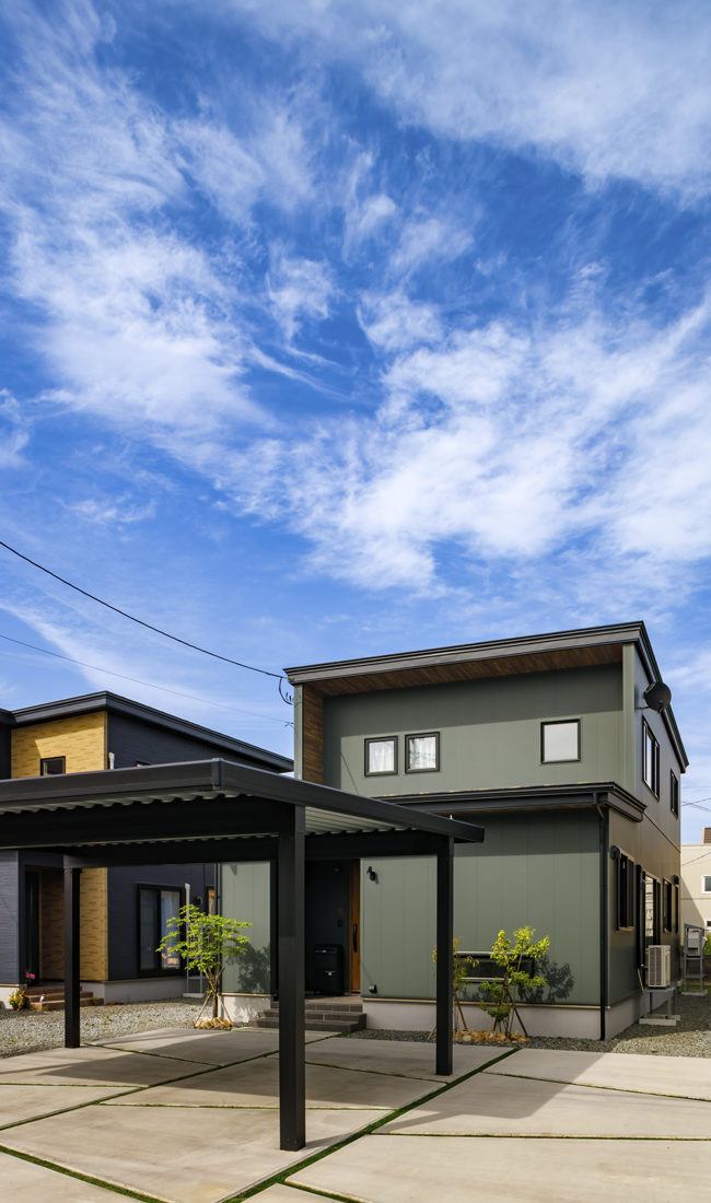 設計・施工 /株式会社 秋田ホーム | 竣工 / 2022/12 | 構造・工法・規模 / 木造軸組工法・2階建 | 敷地面積 / 277.06㎡(83.81坪)|床面積 / 127.50㎡(38.56坪)/ 1階 70.38㎡(21.29坪)2階 57.12㎡(17.27坪)