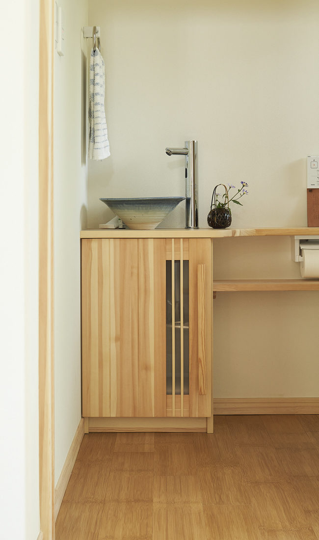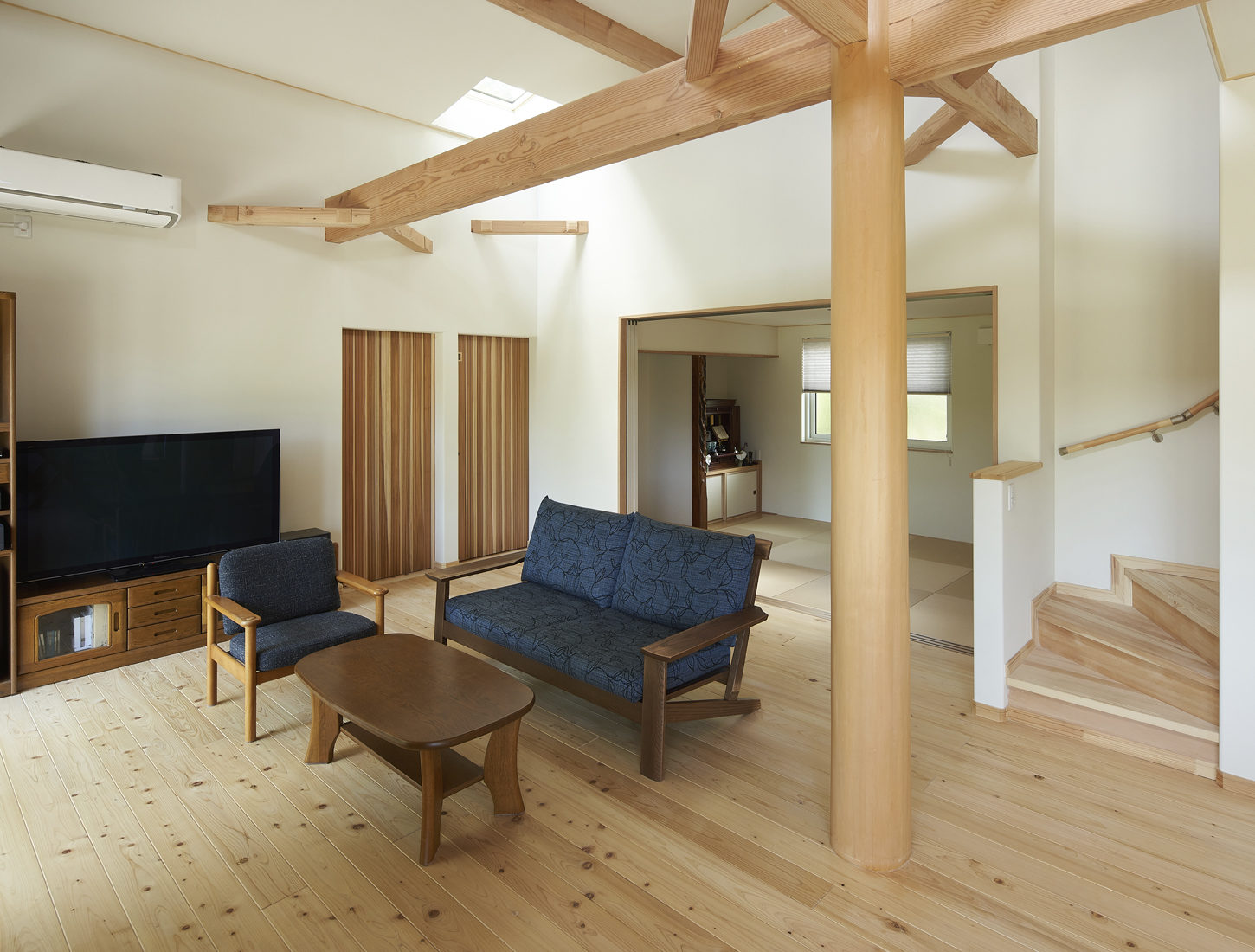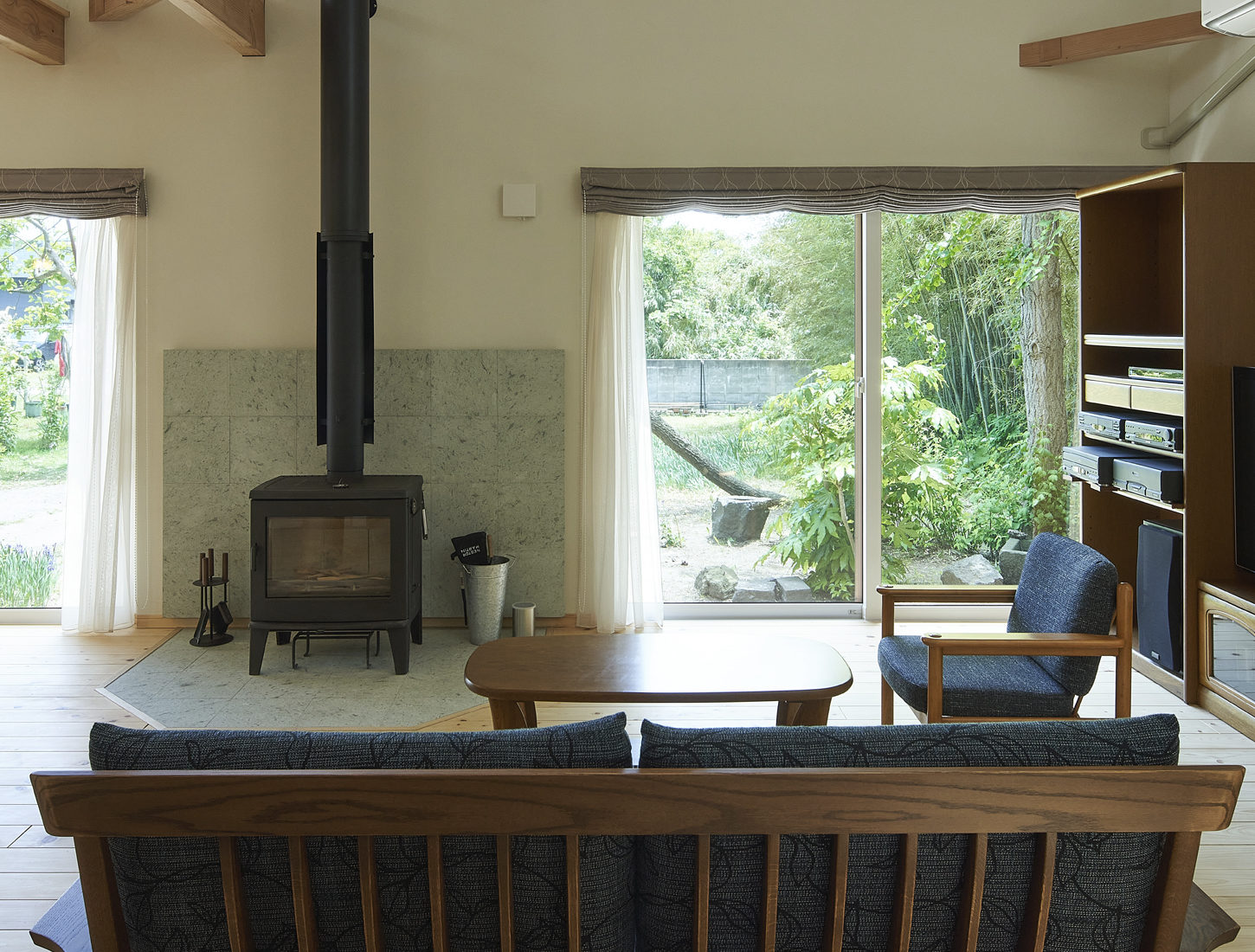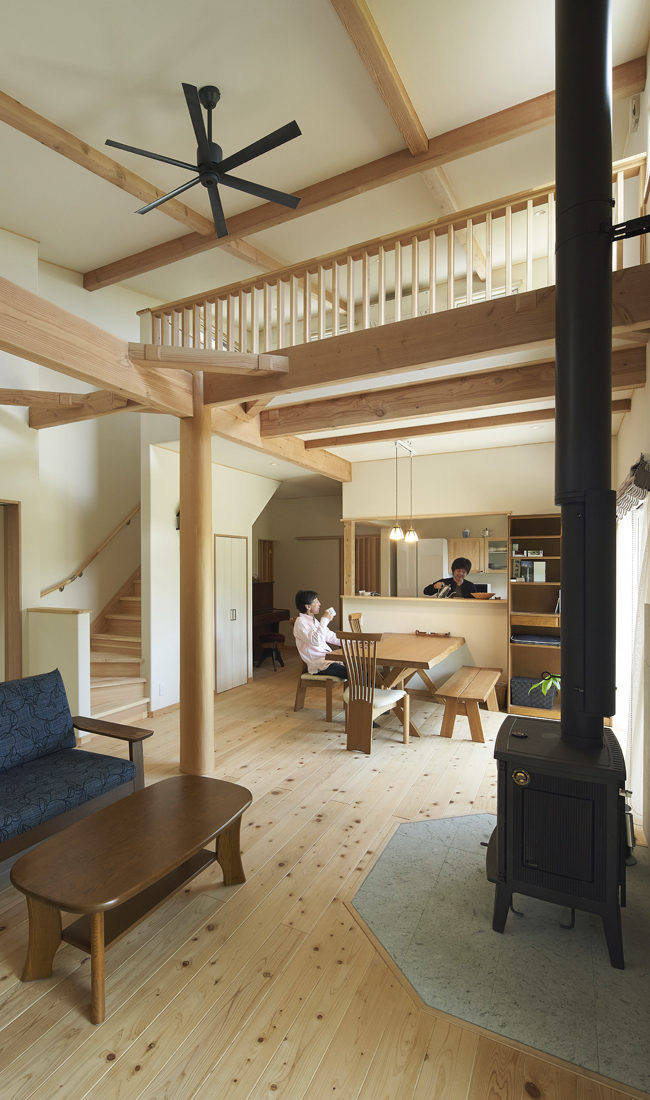 庭に面したリビングの中心には薪ストーブ。「テレビよりもストーブを囲む暮らしがしたい」というRさんが、かねてから憧れていたという。無垢材と天然素材をふんだんに使用する大建らしさが、リビングの大黒柱やオリジナルの建具などに表れている。床には国産のヒノキを使用。白っぽい明るさのある木目は穏やかな印象で、耐久性も優れている点が気に入った。