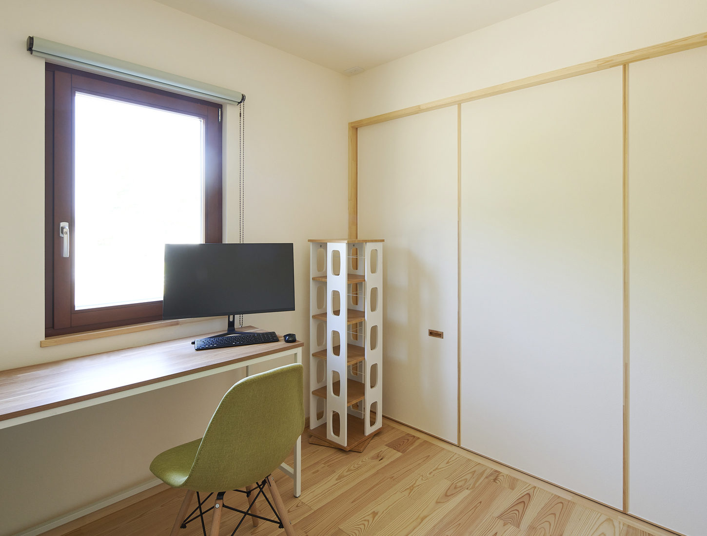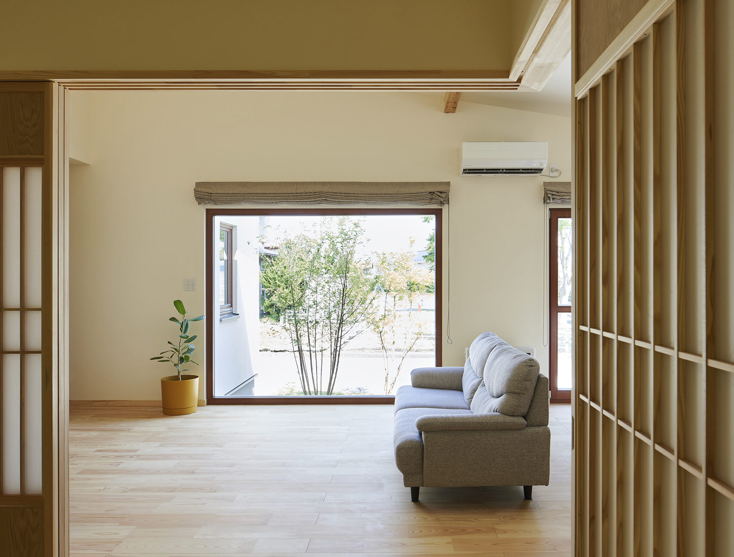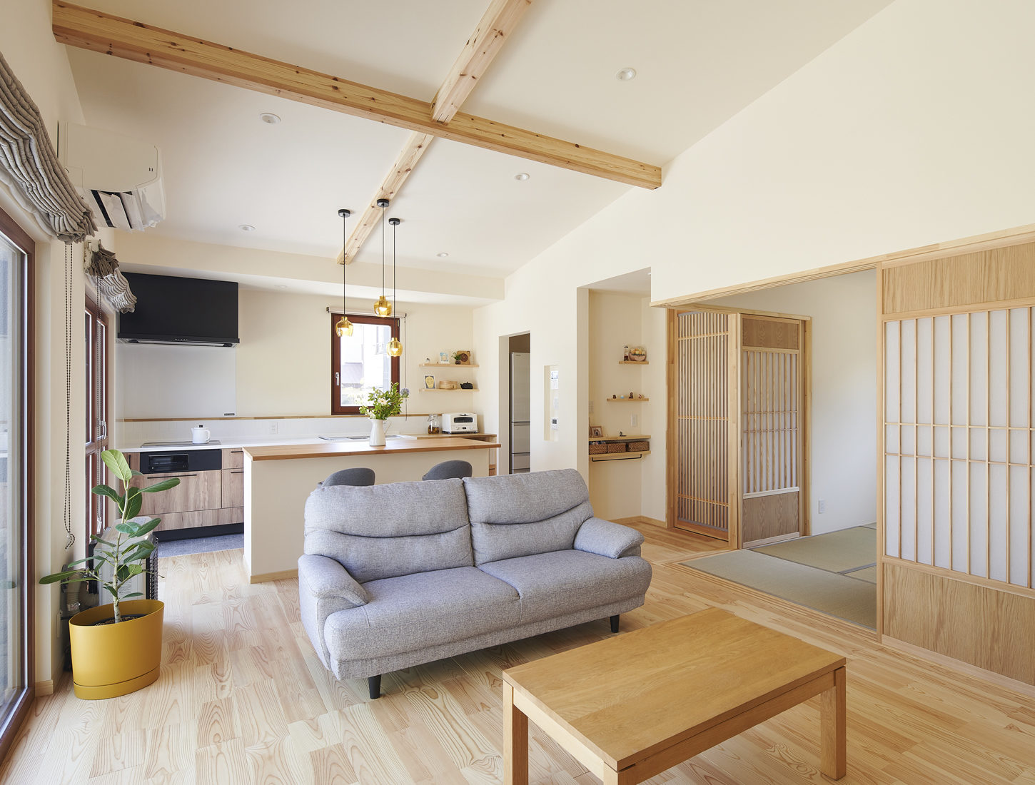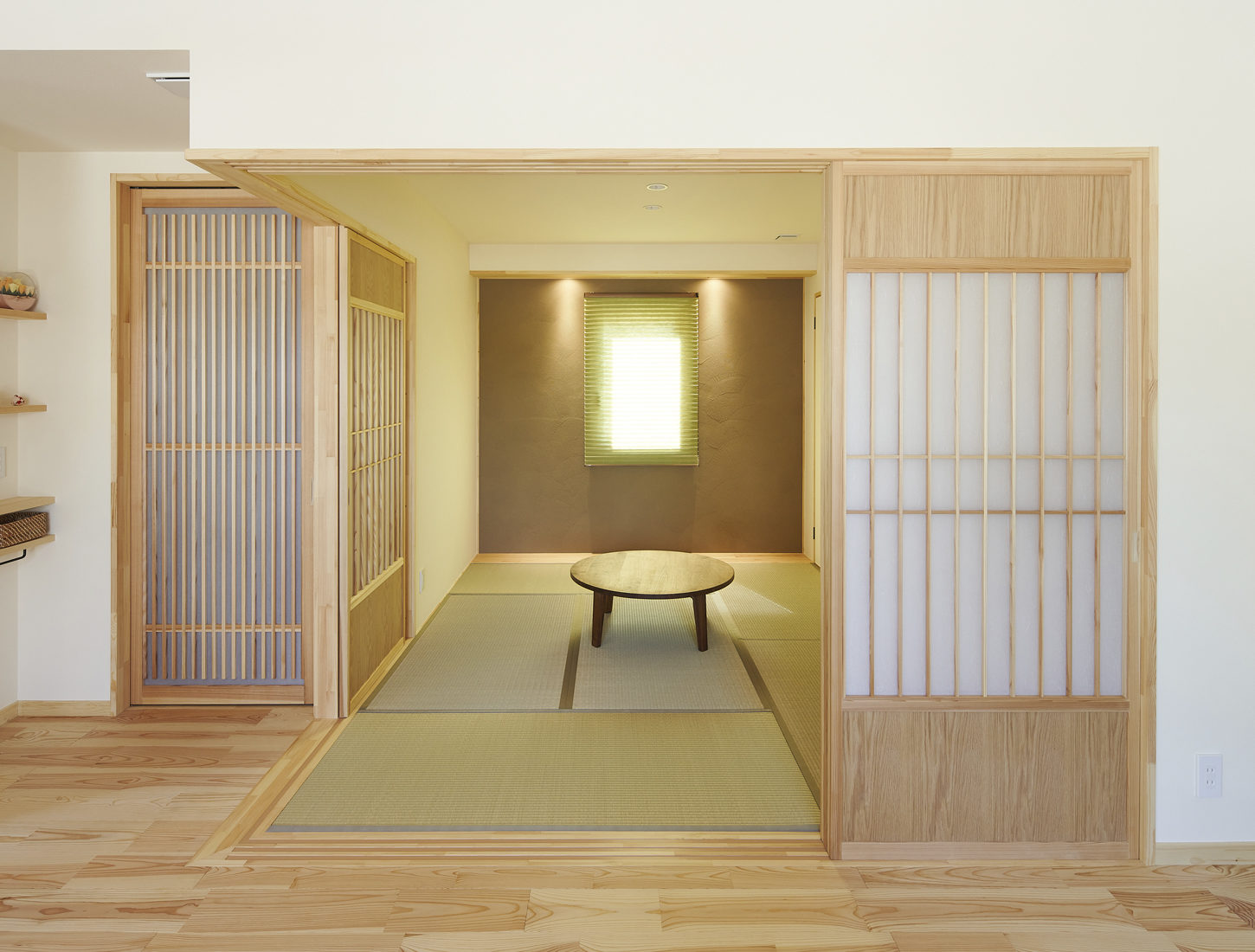 LDKは、半現しの梁が通ったゆるやかな勾配天井が空間に奥行きを感じさせる。隣接する和室は、単なる畳スペースではない。本格的な仕切り建具を入れ、壁は左官仕上げ。照明を当てると波模様が浮き上がる。普段はLDKの延長として家族のくつろぎの場所に、仕切れば客間にもなる。