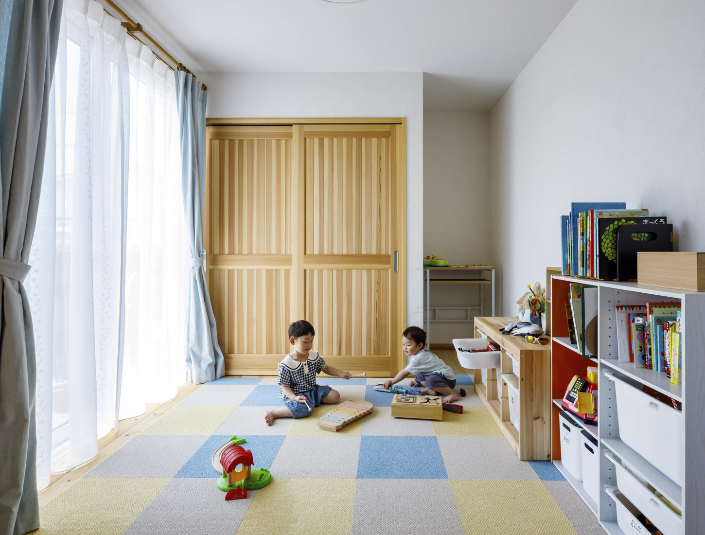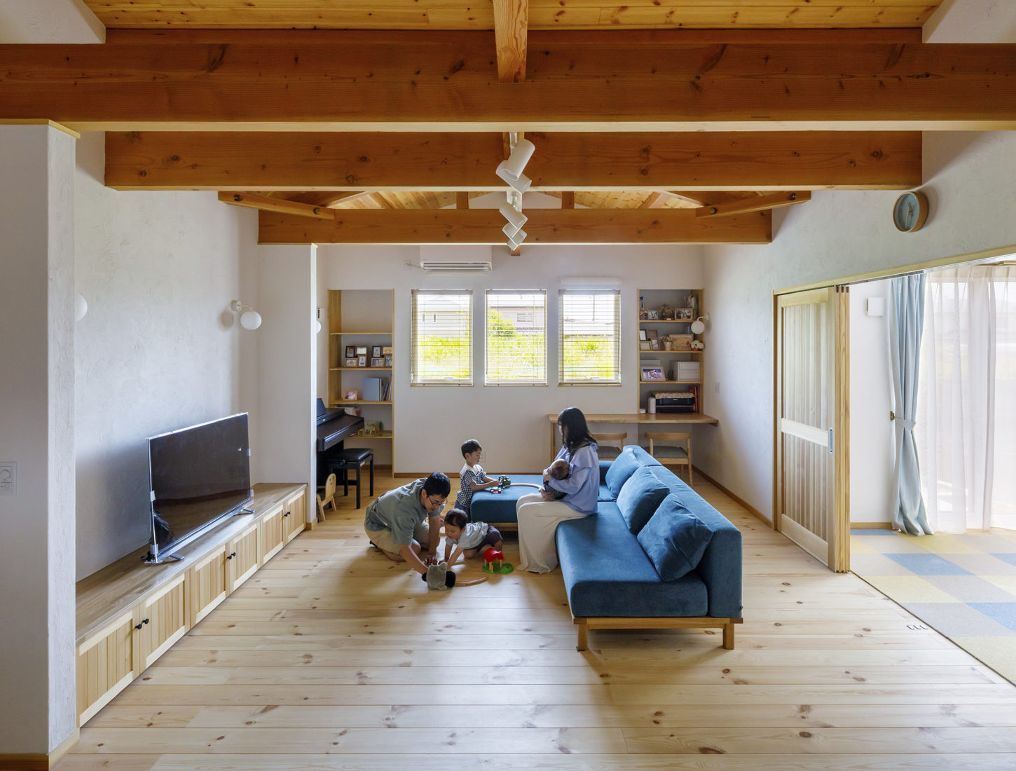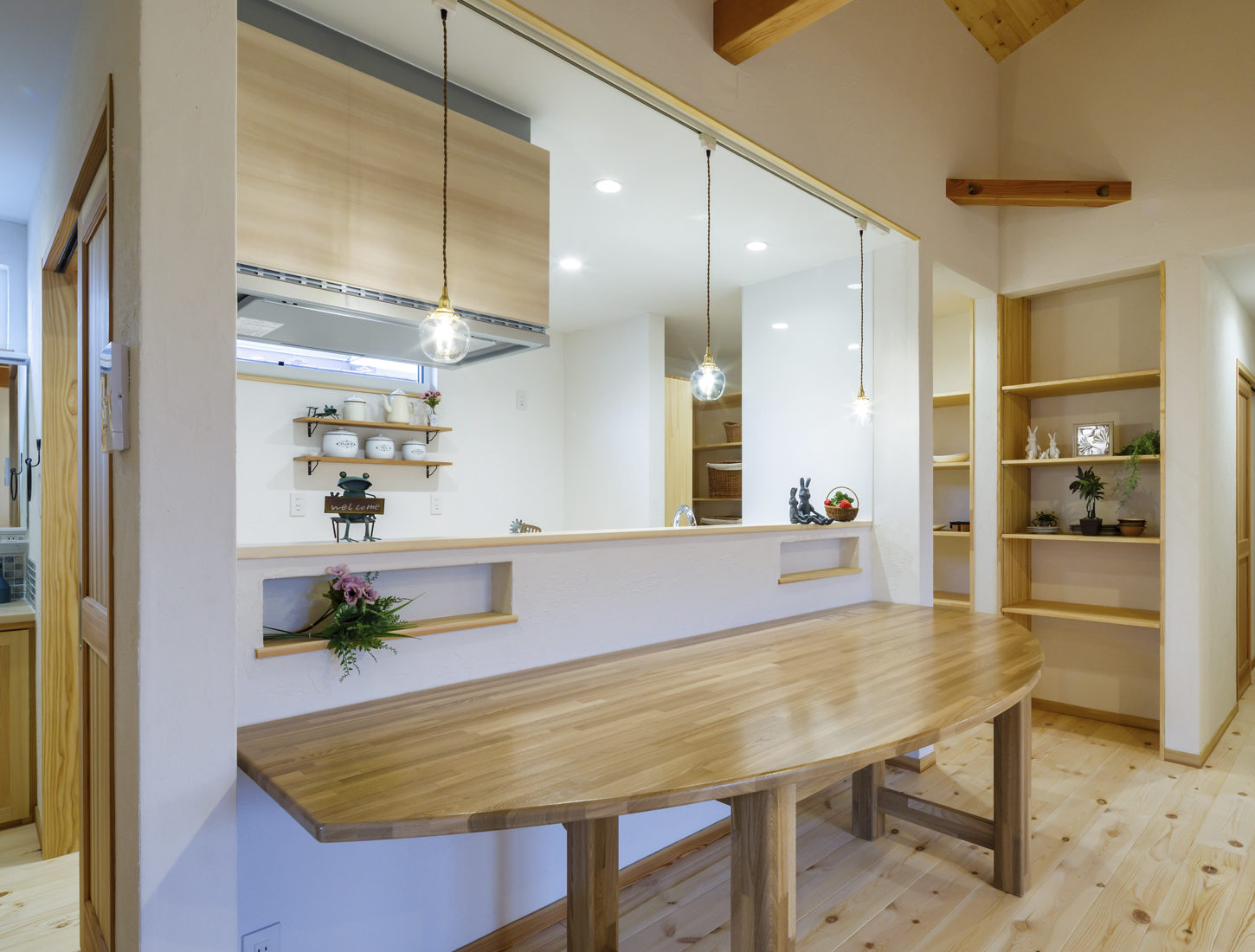 子どもたちが走り回れる広さがあり、高い天井が気持ちの良いLDKで家族は多くの時間を過ごす。Uさんは「キッチンからの眺めがいい。キッチンのペンダントライト越しに、リビングの先に3つの窓が並んでいるところが気に入っている」という。「子どもが生まれてきょうだいが増える中での家づくりは正直大変なこともありましたが、こうして願い通りの居場所ができてよかった」と、Uさん夫妻は将来へ安心感を手に入れた様子で、微笑んだ。