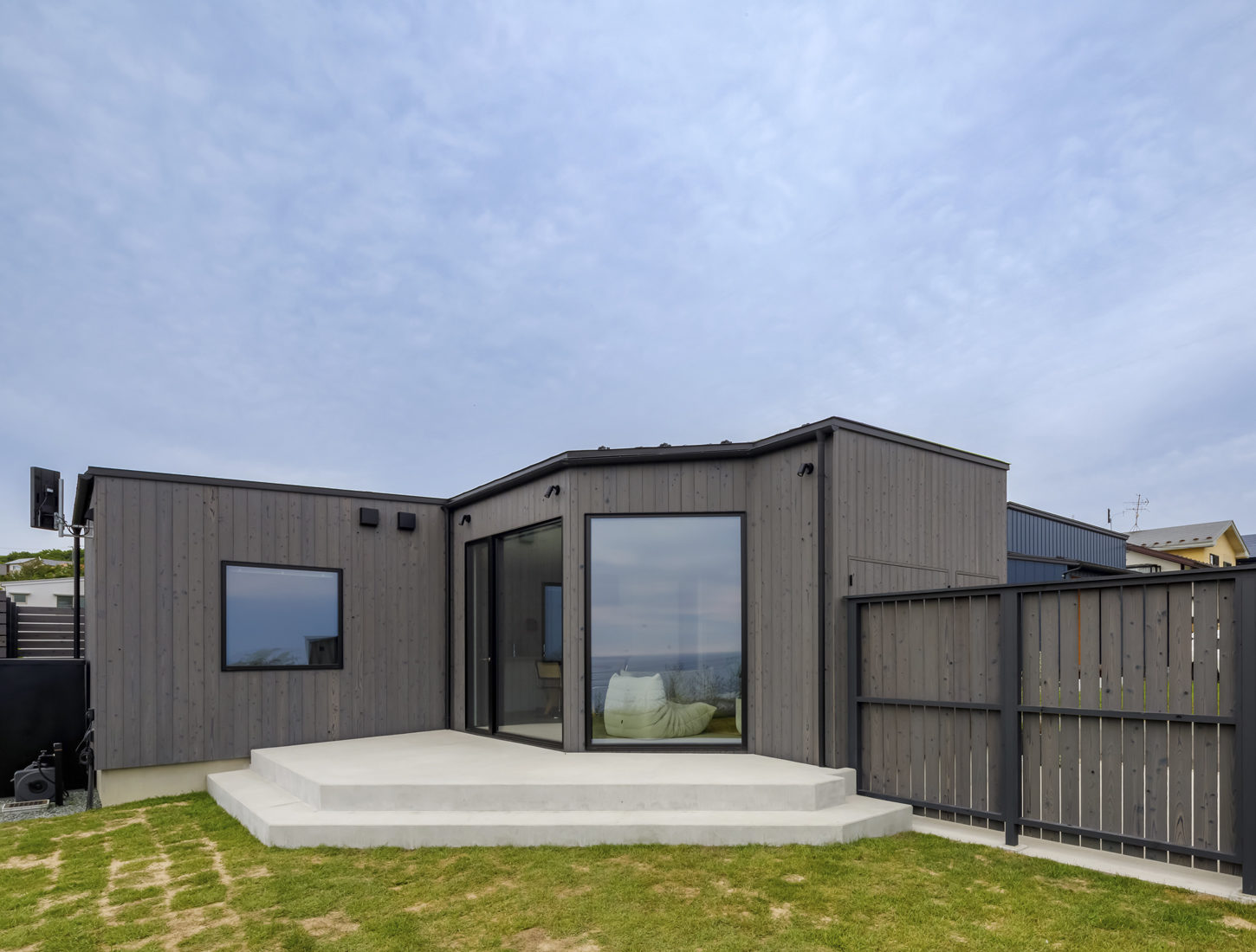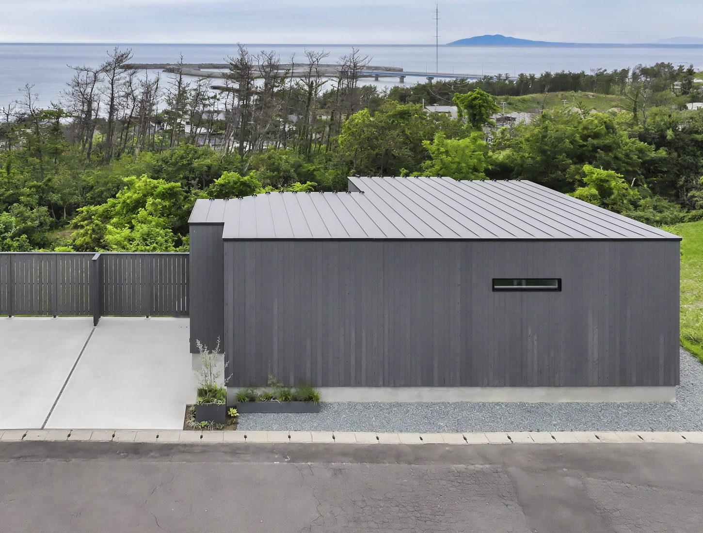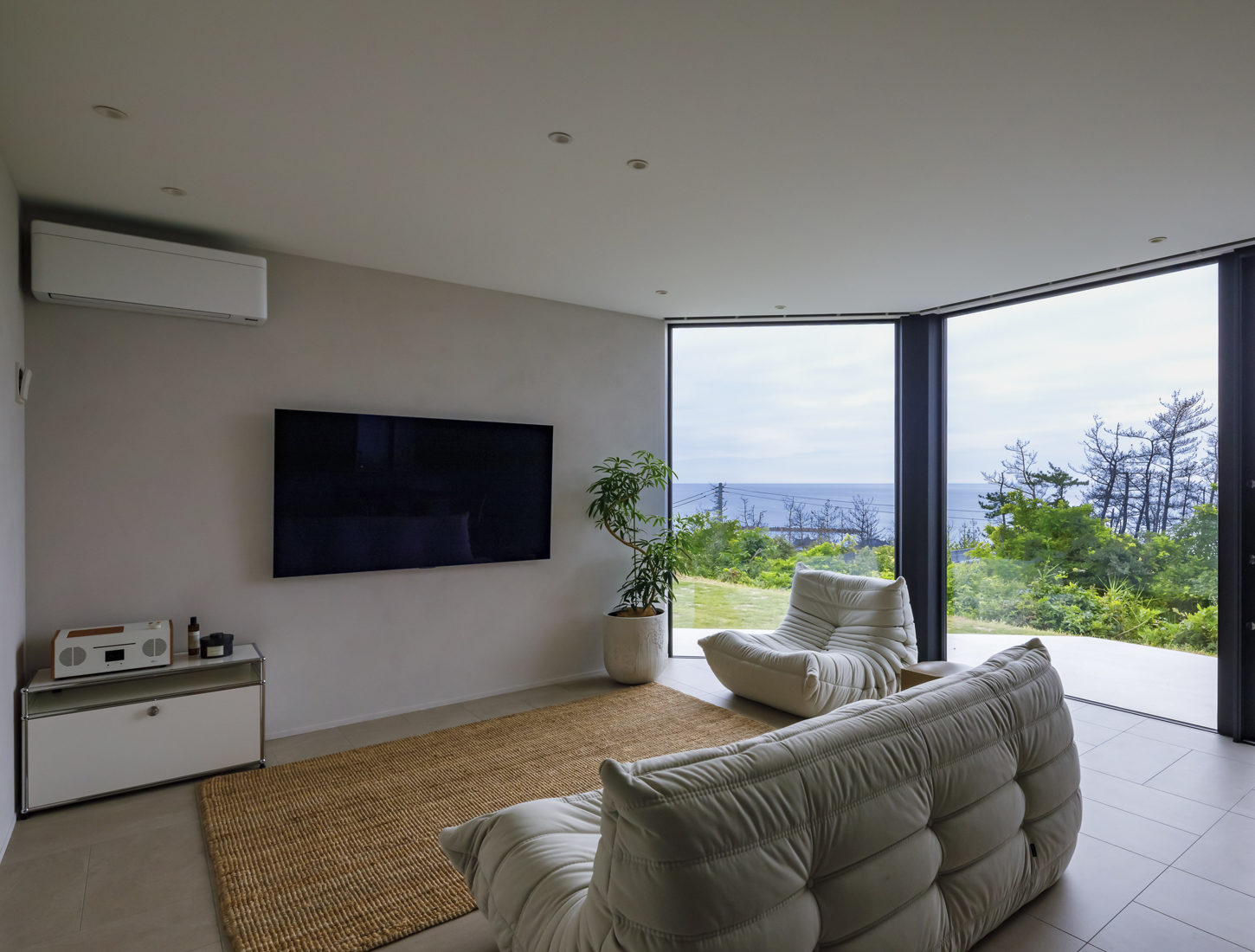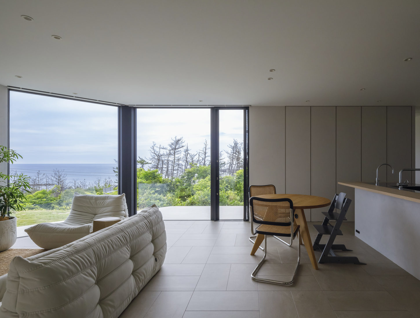 目の前に広がる日本海の眺めが圧巻である。リビング、ダイニング、キッチンのどこにいても海を望むことができる。海に面した南北に細長い立地を見て、村上商店代表の村上さんは西向きに大開口のあるLDKを持つ平屋のプランを「この形でこの向きしかありえない」と熱心に提案した。Sさん夫妻は希望していた平屋であることと、村上さんのLDKの配置に引かれて依頼を決めた。