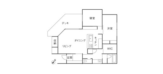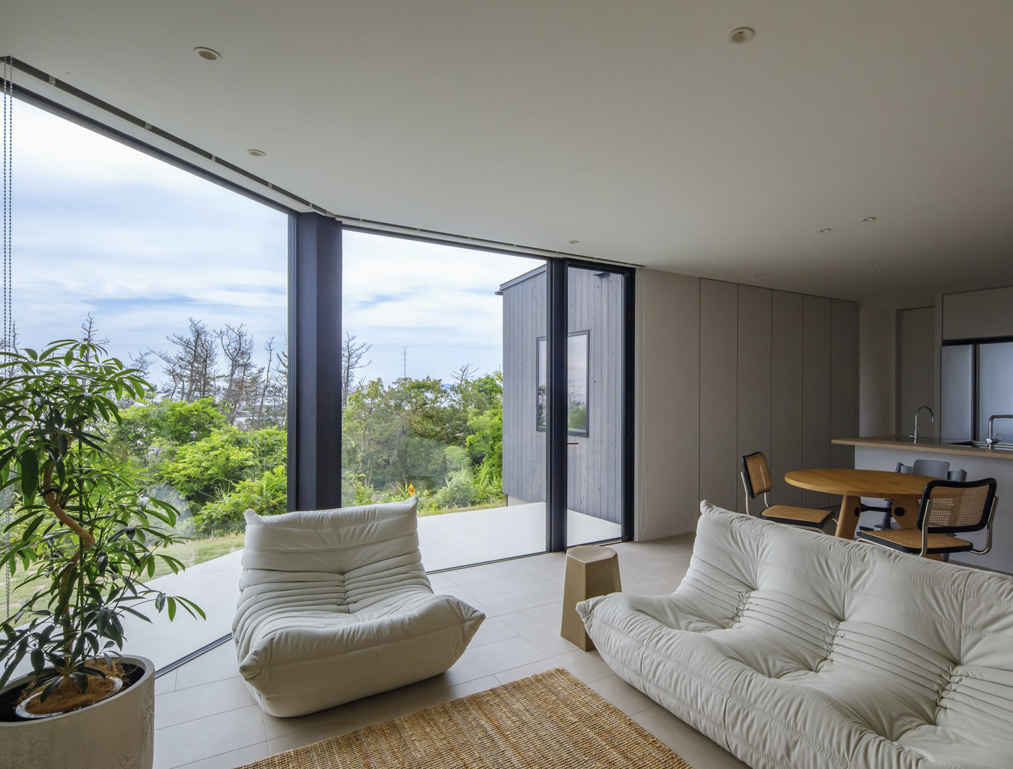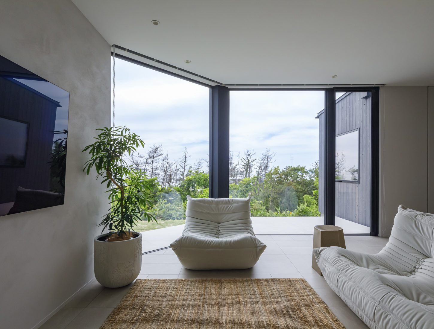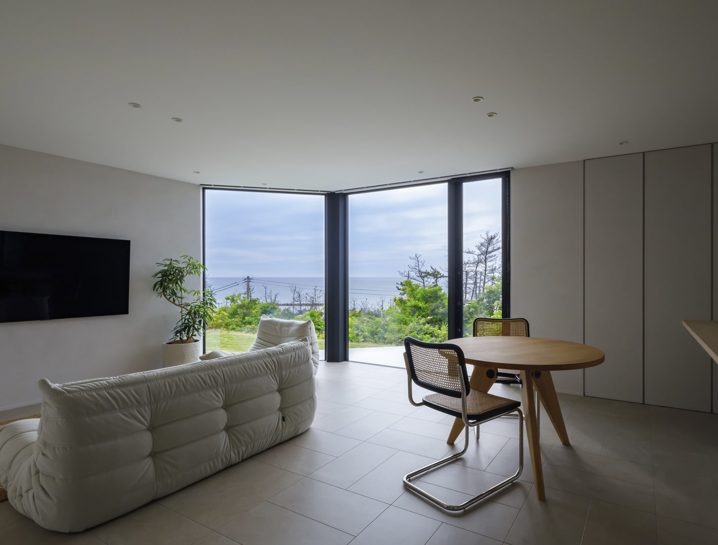 目の前に広がる日本海の眺めが圧巻である。リビング、ダイニング、キッチンのどこにいても海を望むことができる。海に面した南北に細長い立地を見て、村上商店代表の村上さんは西向きに大開口のあるLDKを持つ平屋のプランを「この形でこの向きしかありえない」と熱心に提案した。Sさん夫妻は希望していた平屋であることと、村上さんのLDKの配置に引かれて依頼を決めた。