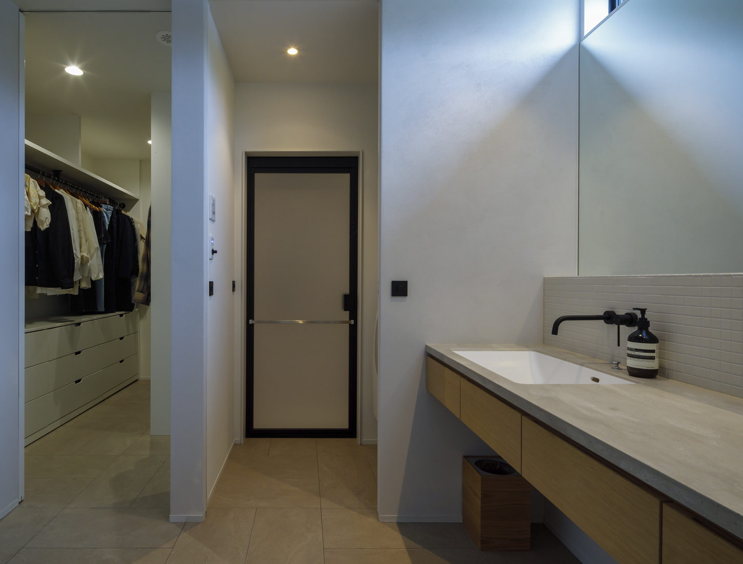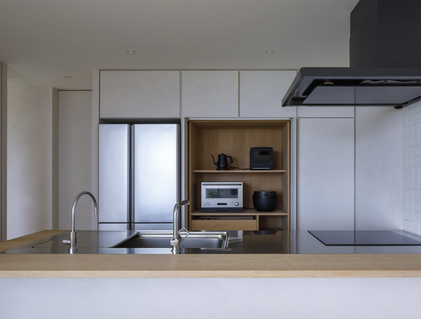 生活感はできれば出したくないが、暮らしにくいのでは本末転倒だ。ということでリビング、キッチン、玄関それぞれに造作収納を設けている。ただし見た目は壁と一体化したもので、扉が天井高と同じ。村上商店の標準的な造作収納ではなく、Sさんの要望で扉の開閉方向や引き手にまでひと手間を加えたそうだ。