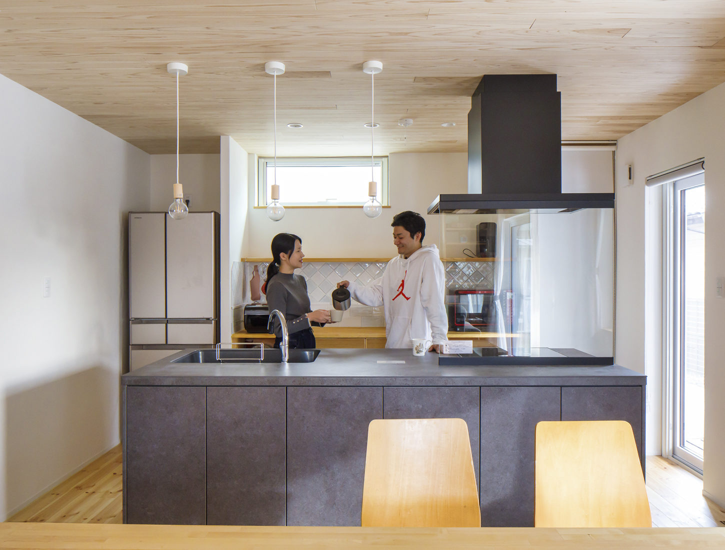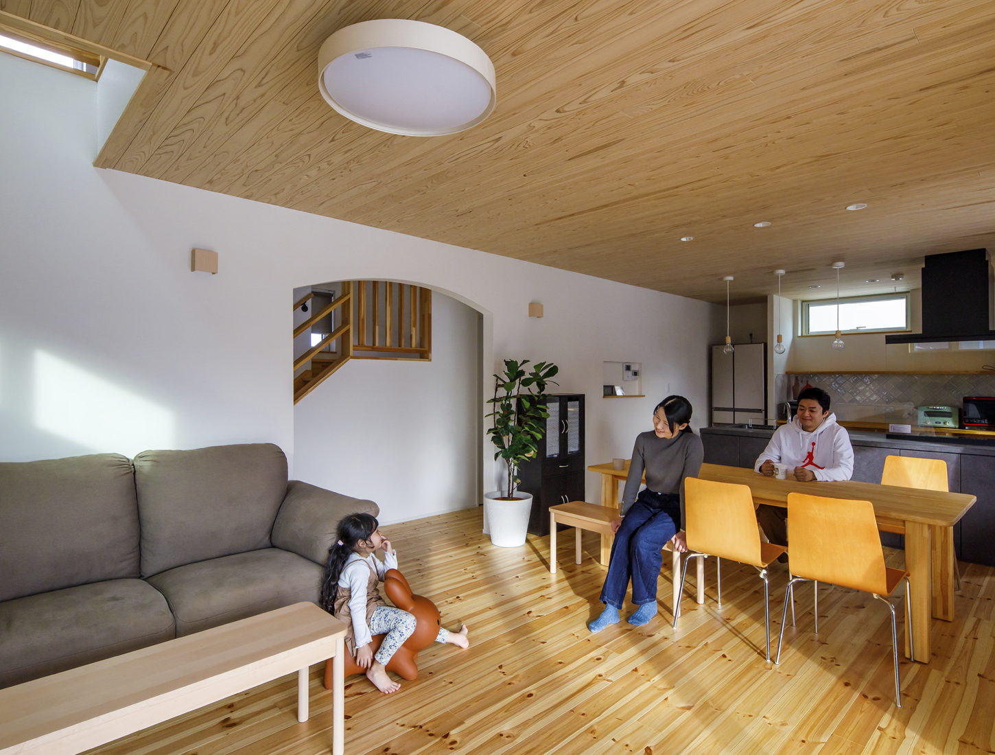 K邸は宮城県仙台市。Kさん夫妻が選んだビルダーは秋田県山本郡八峰町にあるCHORALYだった。 家づくりをはじめて、最初は大手ハウスメーカーや地域の工務店などを見て回ったというKさん夫妻。デザインや性能に加えて、重視したのが丁寧な建て方で信頼関係が築けるかという点だったという。「工場で作ったものを現場で組み立てるということではなく、現場で大工さんに丁寧に家を建ててもらいたいという理想がありました。幼い頃の記憶として、実家がそうだったので」と妻のRさん。その実家を建てたのがCHORALYで建築を担当する菊地建業だった。「父が性能にこだわって建てたこともあって、実家は快適でしたし、点検や修繕で菊地さんたちの仕事の丁寧さも見ていたので、信頼していました」とRさん。秋田にあるモデルハウスも見学し、今も仙台市での建築が可能であればと依頼することになったそうだ。