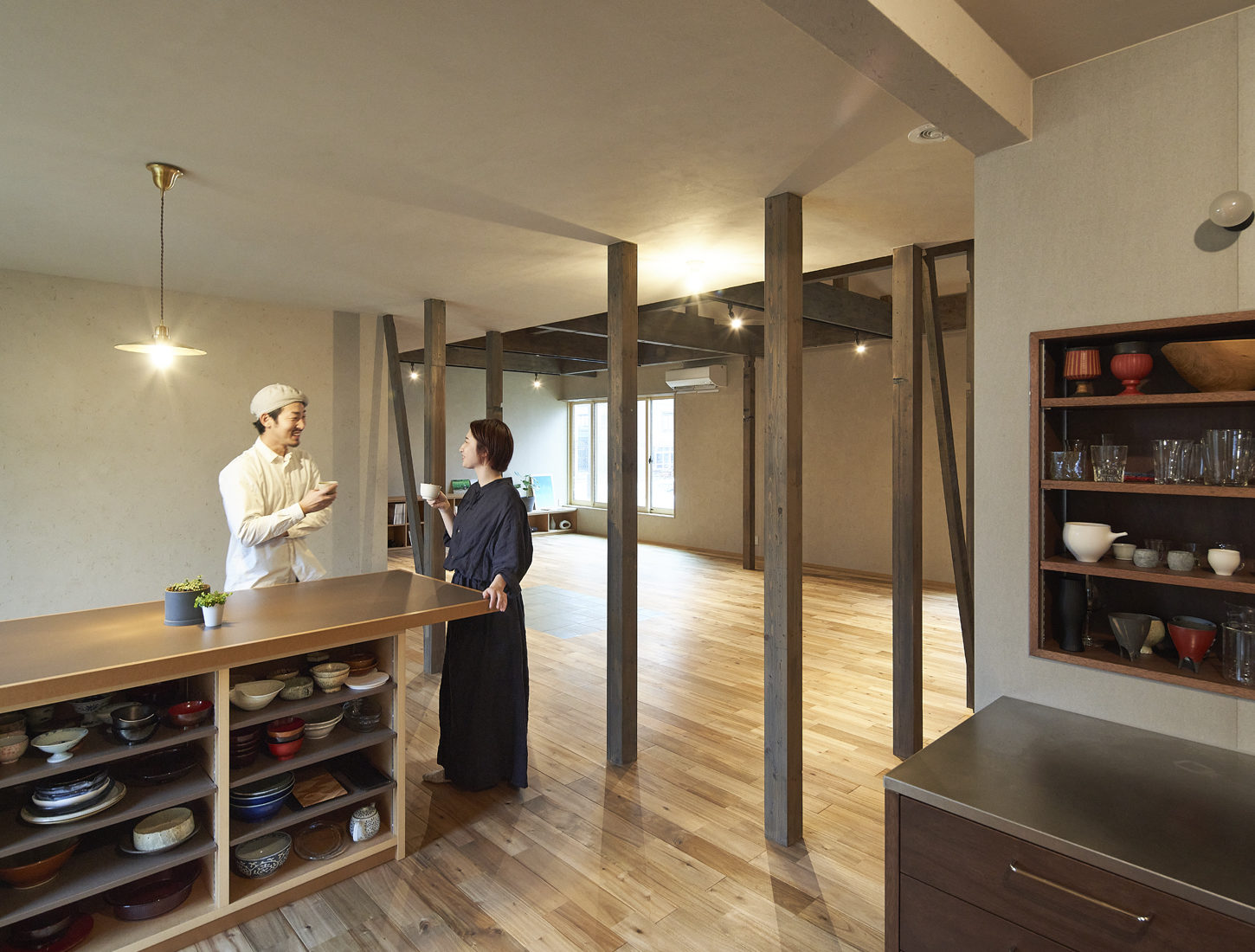 「人が混じり合う空間」がテーマとなった住まい。42帖の大空間のLDKは料理をする人、食べる人、そして語らう人が自然に集まれる場所になっている。ハイスツールを置くこともあるカウンターは、ときに立ち飲み場としても活躍する。Hさん夫妻二人のための住まいでもあるが、単なる住居の枠を越え、県内外から多くのゲストが集まり、飲み交わし、宿泊してまた旅立っていく。交流の場として外部に開かれているような感覚が、夫婦のライフスタイルにもぴったりだという。