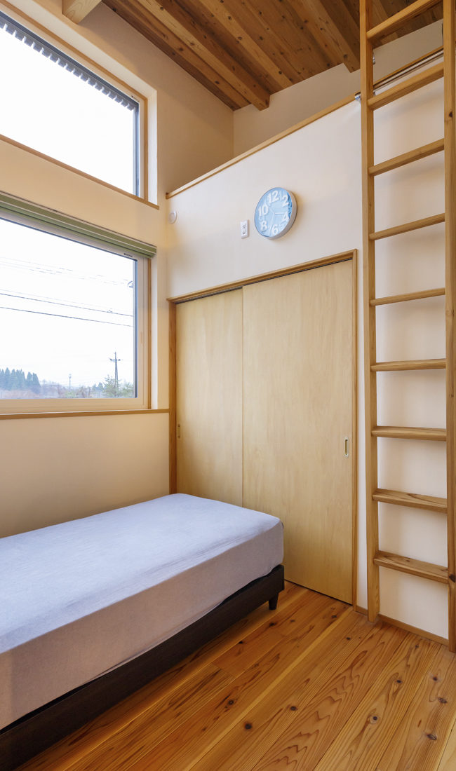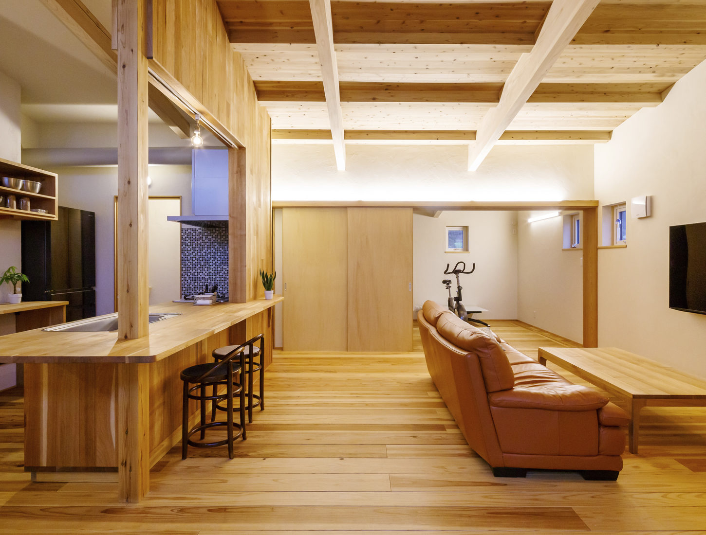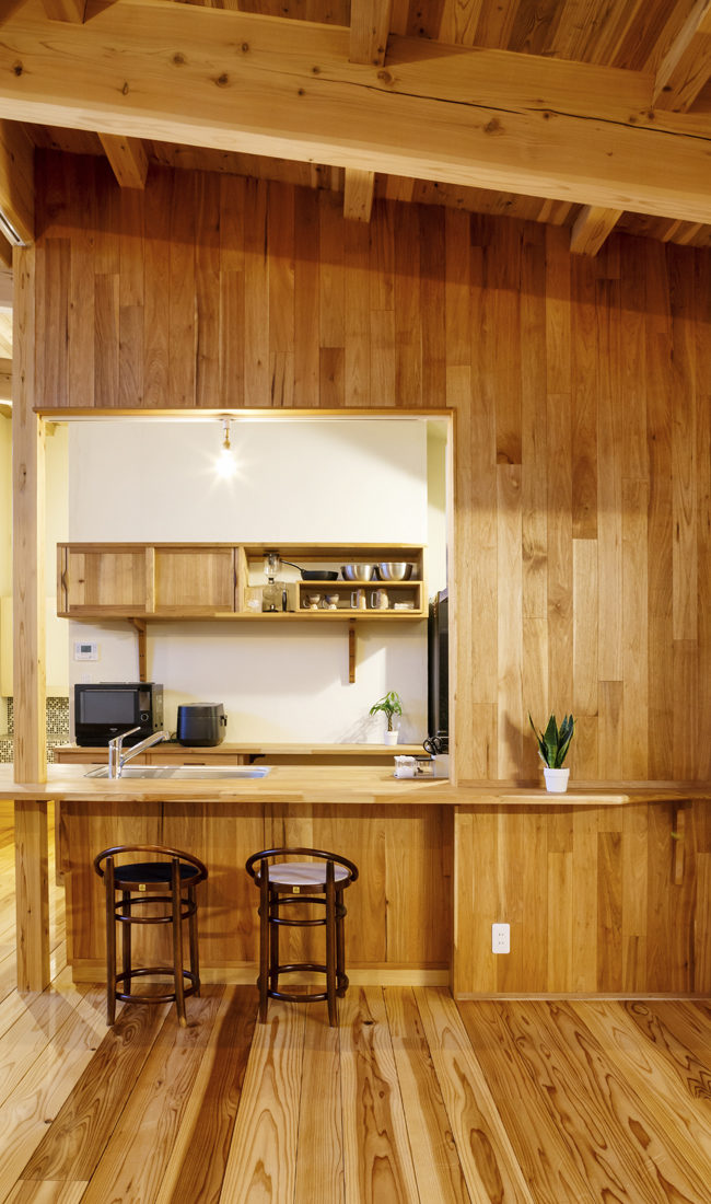 S邸は、自ら所有する山から切り出した秋田スギを2年間乾燥させて使用している。「節も少ないきれいな材料が取れたのでリビングの柱や梁、外壁のファサードラタンなどに見えるところに積極的に使用しました」と代表の池田さん。フルオーダーの木のキッチンやリビングの飾り棚は、鷹巣の家具店HOLTOに依頼。「木にこだわりがある点で、夫と話が合ったみたいです」とNさんは笑う。内装の壁は一家総出で珪藻土を塗り、外壁のファサードラタンも自分たちで塗装。時間をかけ、手をかけて生まれた住まいは愛着もひとしおだ。