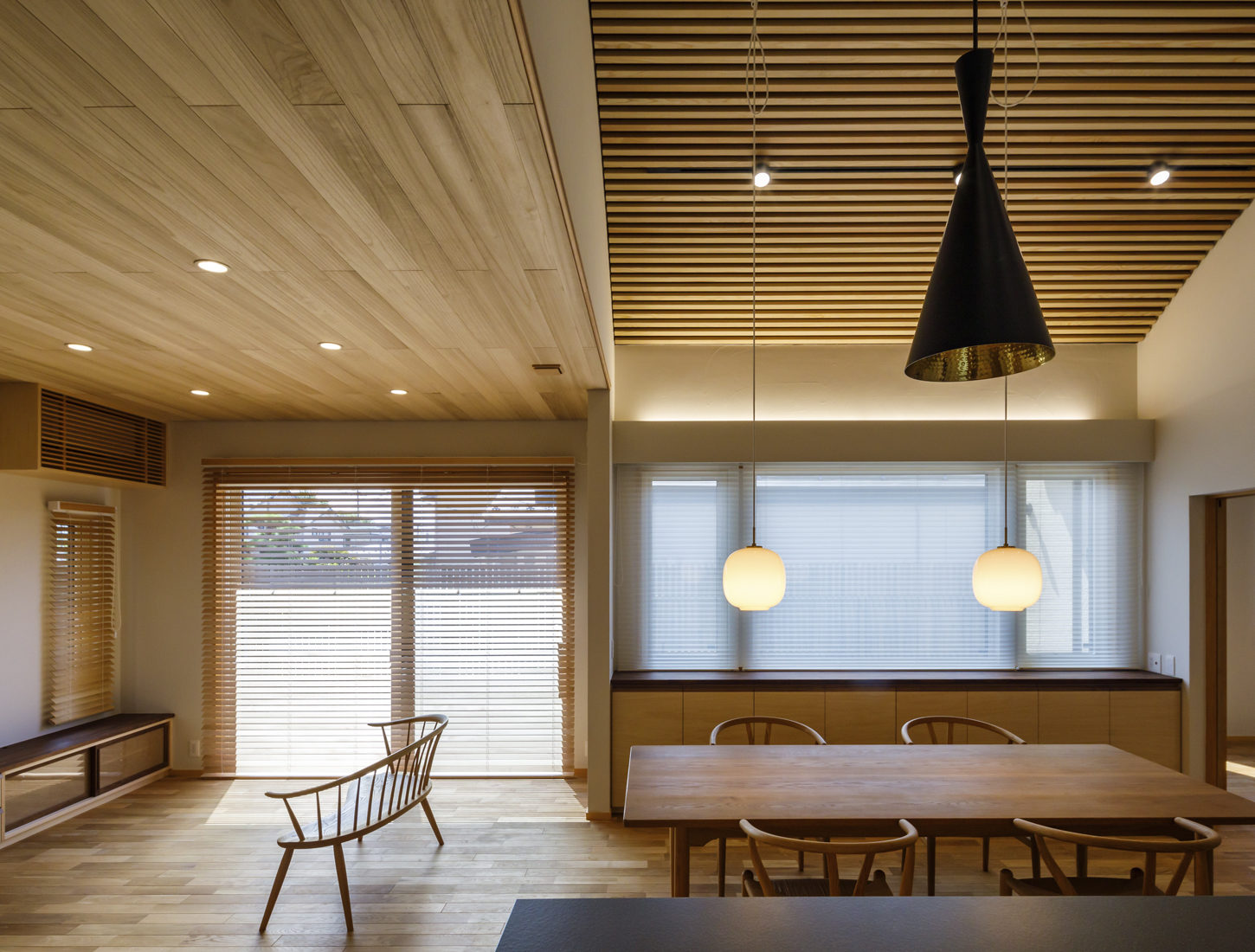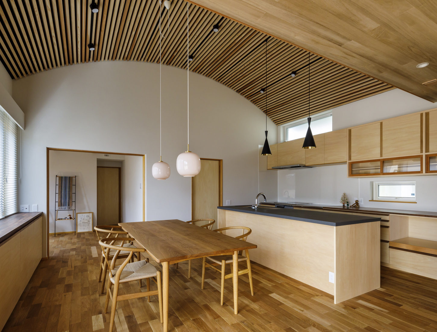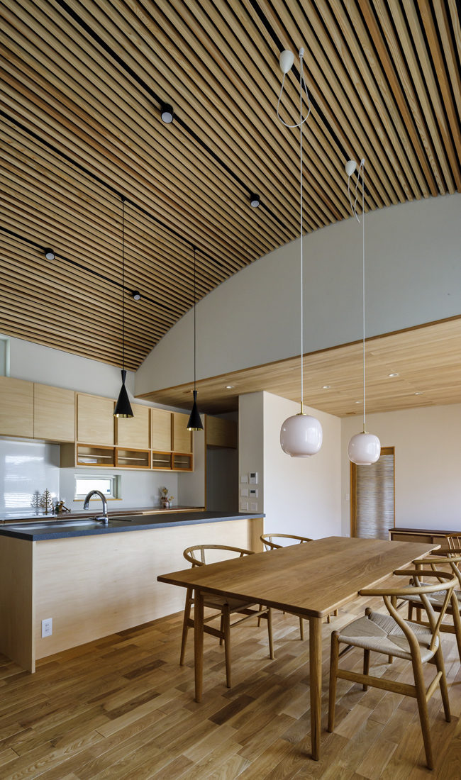 天井がアールを描く様子がダイナミックなダイニング、キッチン。ルーバー天井と優美なアールの組み合わせが、洗練された雰囲気と奥行きを感じさせる。LDKの中心には子どもたちとも一緒に立てるゆとりの幅があるⅡ型のキッチン。キッチンとダイニングに対して、平天井でコントラストを出した木質感豊かな印象のリビング。庭と住まいの間にはデッキが設けられ、庭に近い暮らしを叶えている。