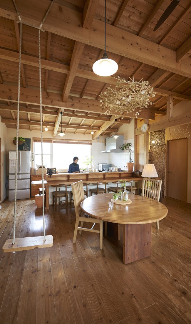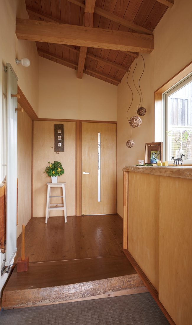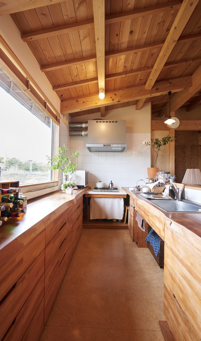 夫婦二人の静かな暮らしに多くの部屋数や広いスペースは必要ないと考えたSさんたちには平家のイメージが当初からあったという。住み始めて10年経つというS邸は、耳付き一枚板の天然秋田杉のカウンターや無垢のフローリングにも艶と風合いが出ている。