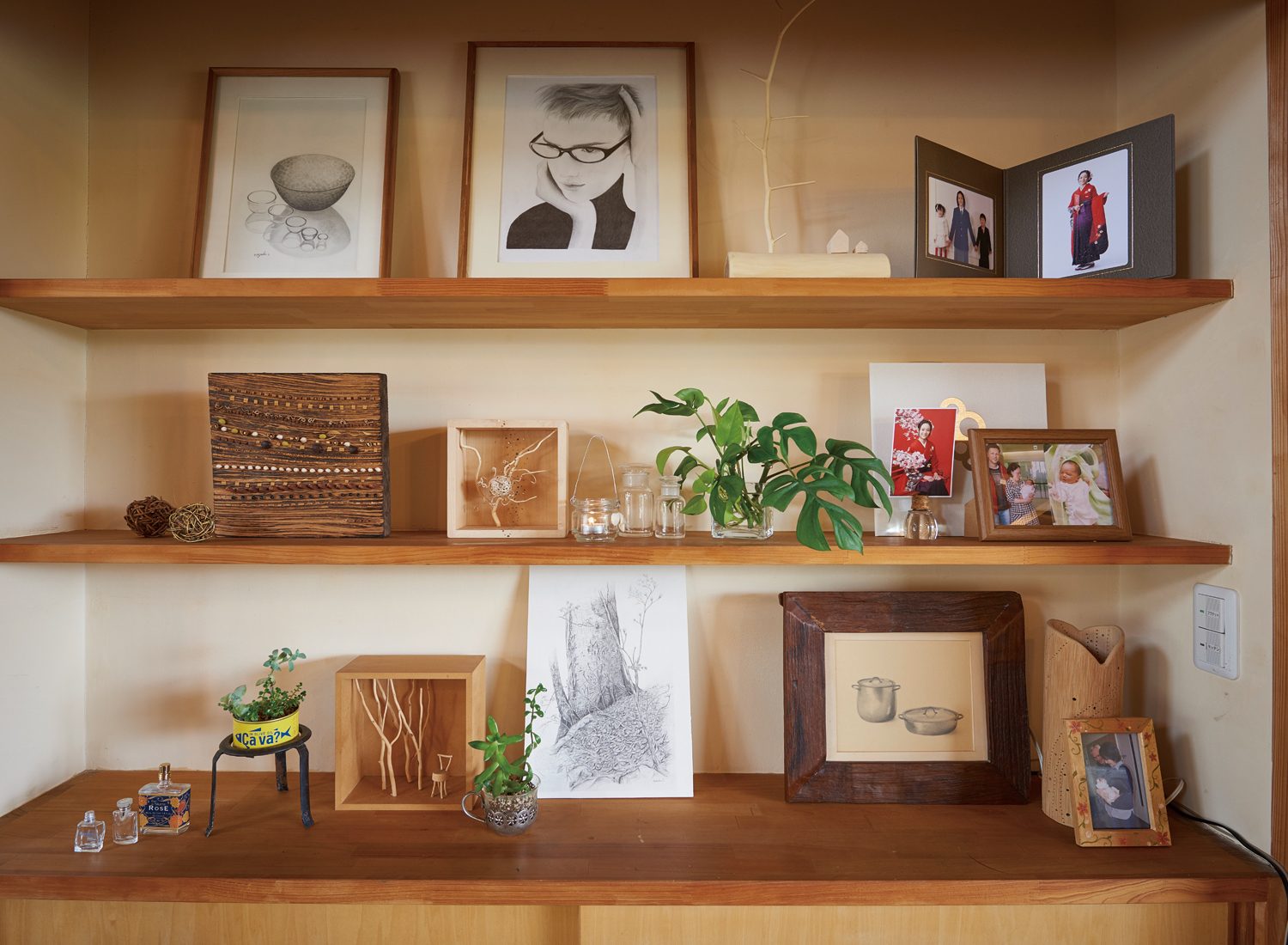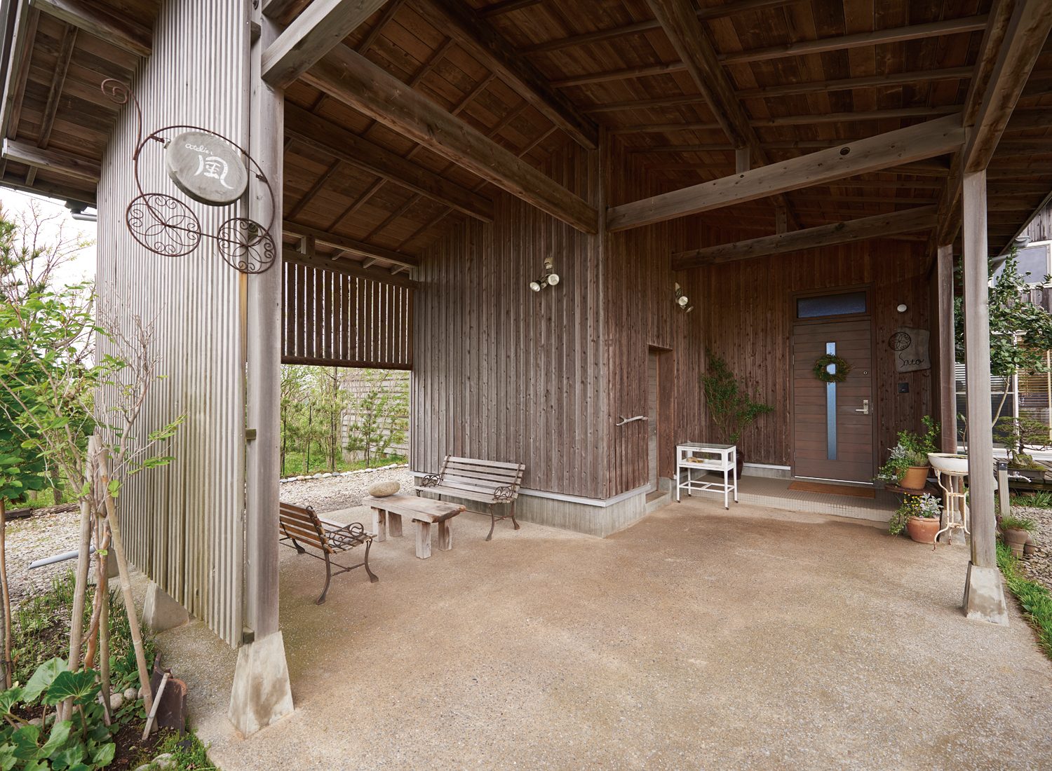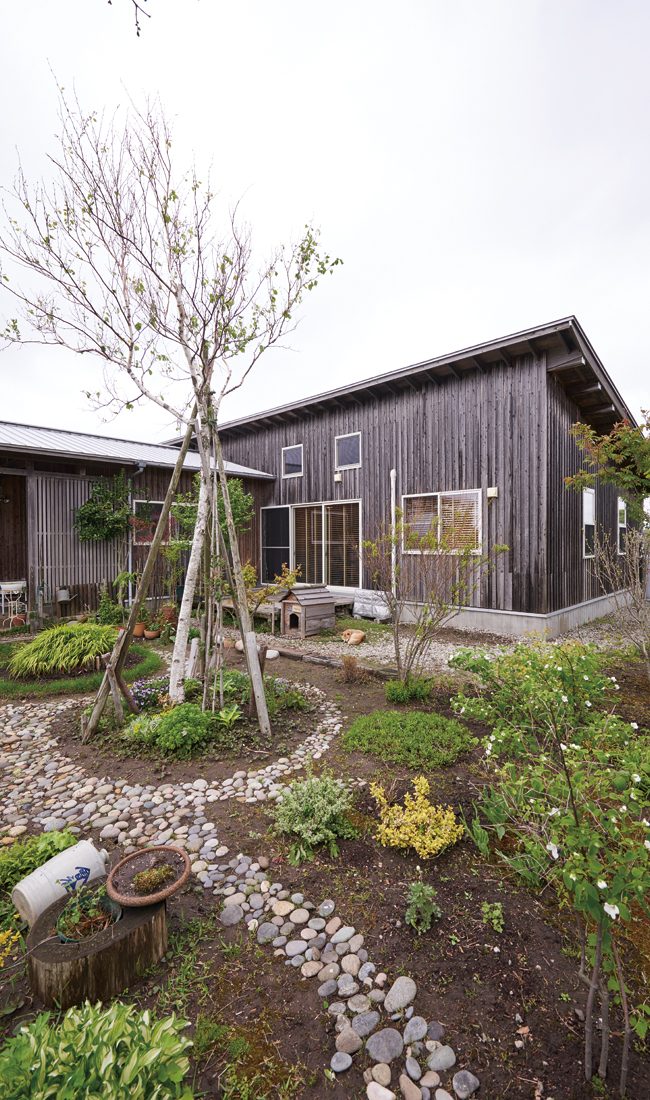 白神山地が一望できる絶好のロケーションに立つS邸。丹精込められた庭と木の外観とが相まって、まるで絵本から飛び出してきたかのような印象さえある。妻のTさんは植物のつるや石、流木などを素材にオブジェなどをつくる造形作家。定年を迎えた夫のSさんと二人で庭づくりと畑づくりを楽しみながら、自身の創作のための材料集めに山や海に出かけることもしばしばだという。