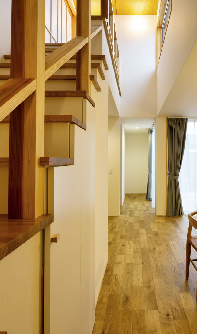 自然光を取り入れつつ、人工の光も巧みに操っている。直射日光を遮り、温かい雰囲気のリビング。天井に間接照明が仕込まれており、日暮れ後の雰囲気もまたよいという。南東の開口部や階段ホールの高窓からは朝日が差し込み、一日の始まりを演出する。「一日を通して家のなかの表情が変わっていくところもたまりません」と満足気なKさん夫妻であった。