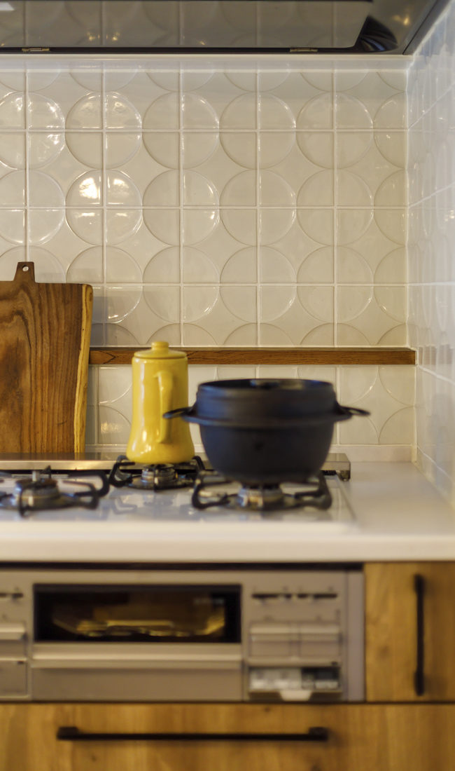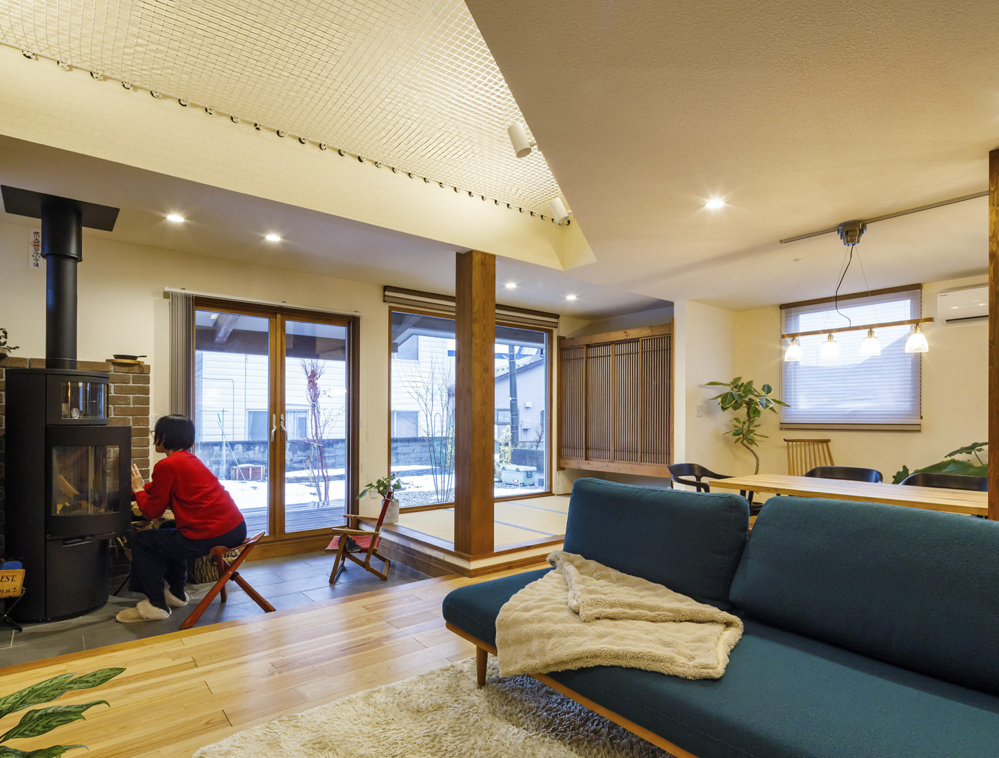 モデルハウス見学を経て自分たちの家づくりのイメージを膨らませていった。将来を考えて1階の水回りのそばに設けた寝室や大窓の前に設えた畳スペース、大きな軒のあるウッドデッキなど、モデルハウスからアイデアを採用した要素も多い。なかでも、Sさんは軒下のウッドデッキで過ごす時間がお気に入りだという。一方で、Mさんのお気に入りはHETAの薪ストーブ。最初は薪ストーブに乗り気ではなかったSさんも、今ではその暖かさや炎のある暮らし、ストーブでの料理も楽しんでいるそうで、休日には子どもたちも手伝って家族で薪割りをして新たな暮らしを楽しんでいるという。