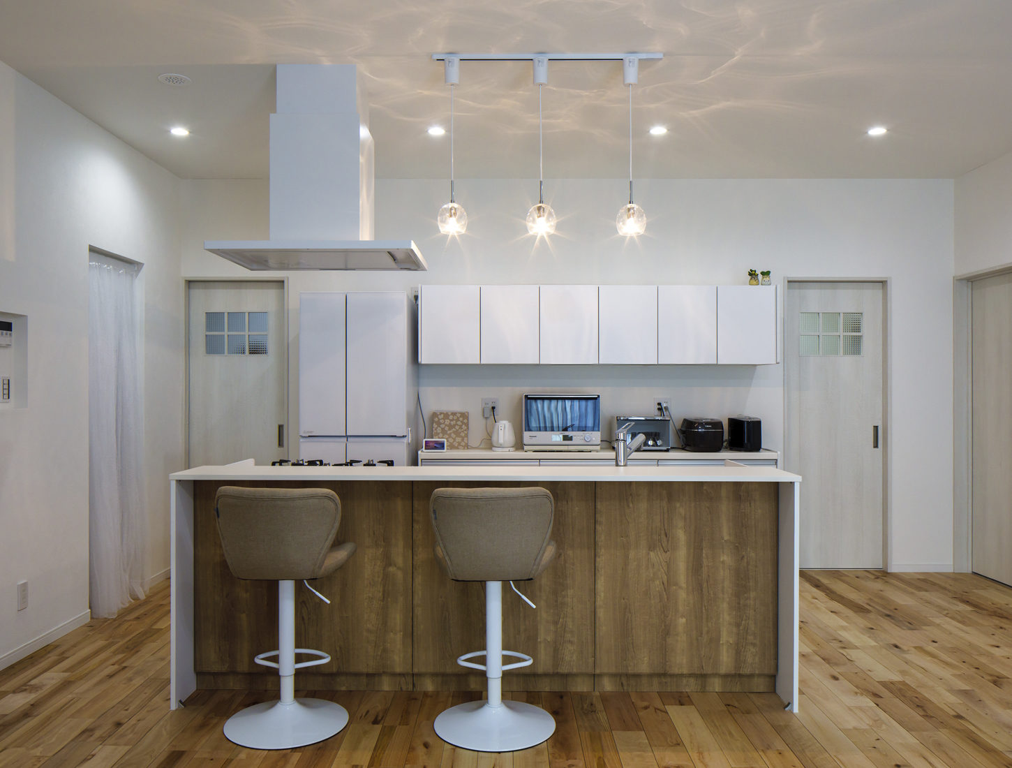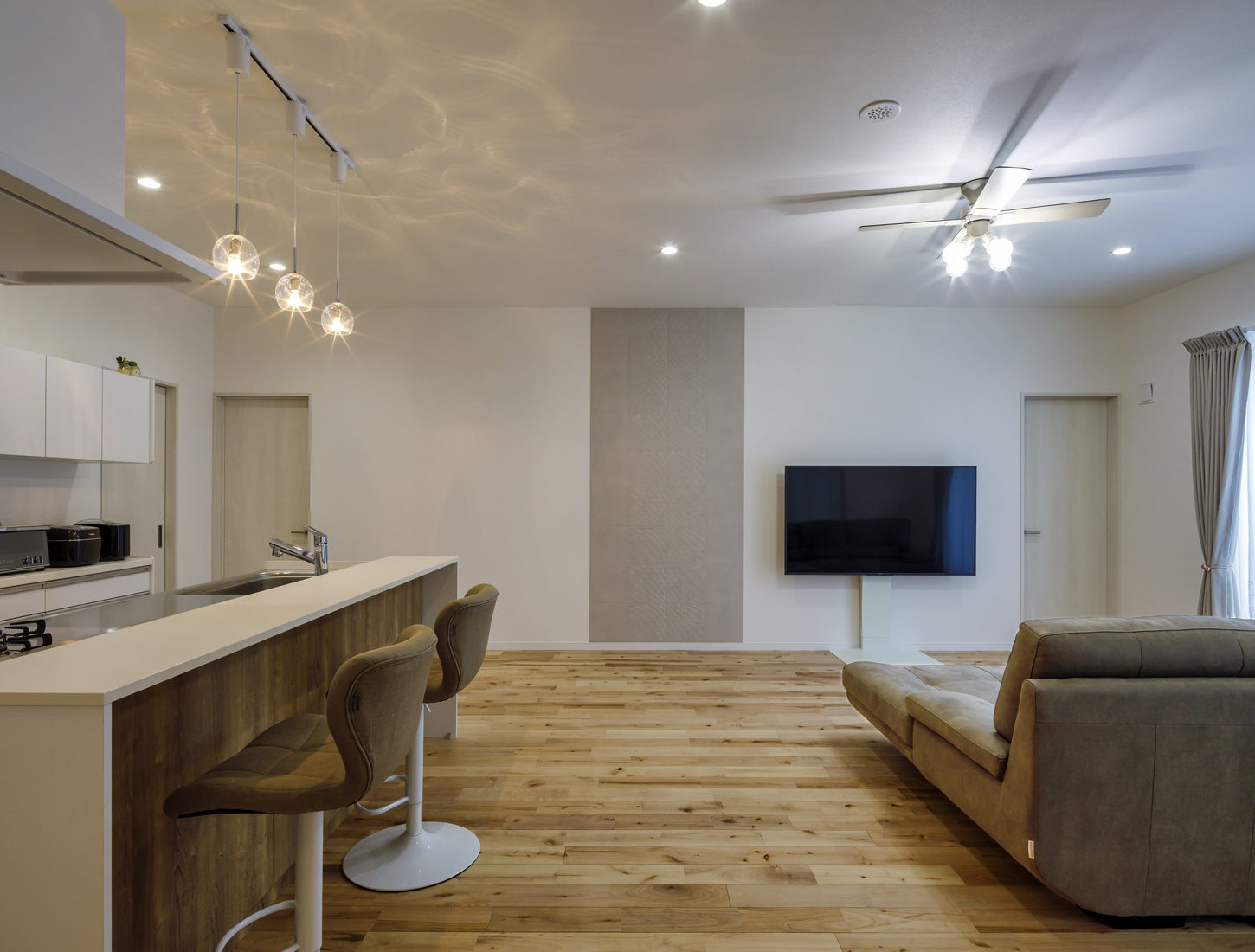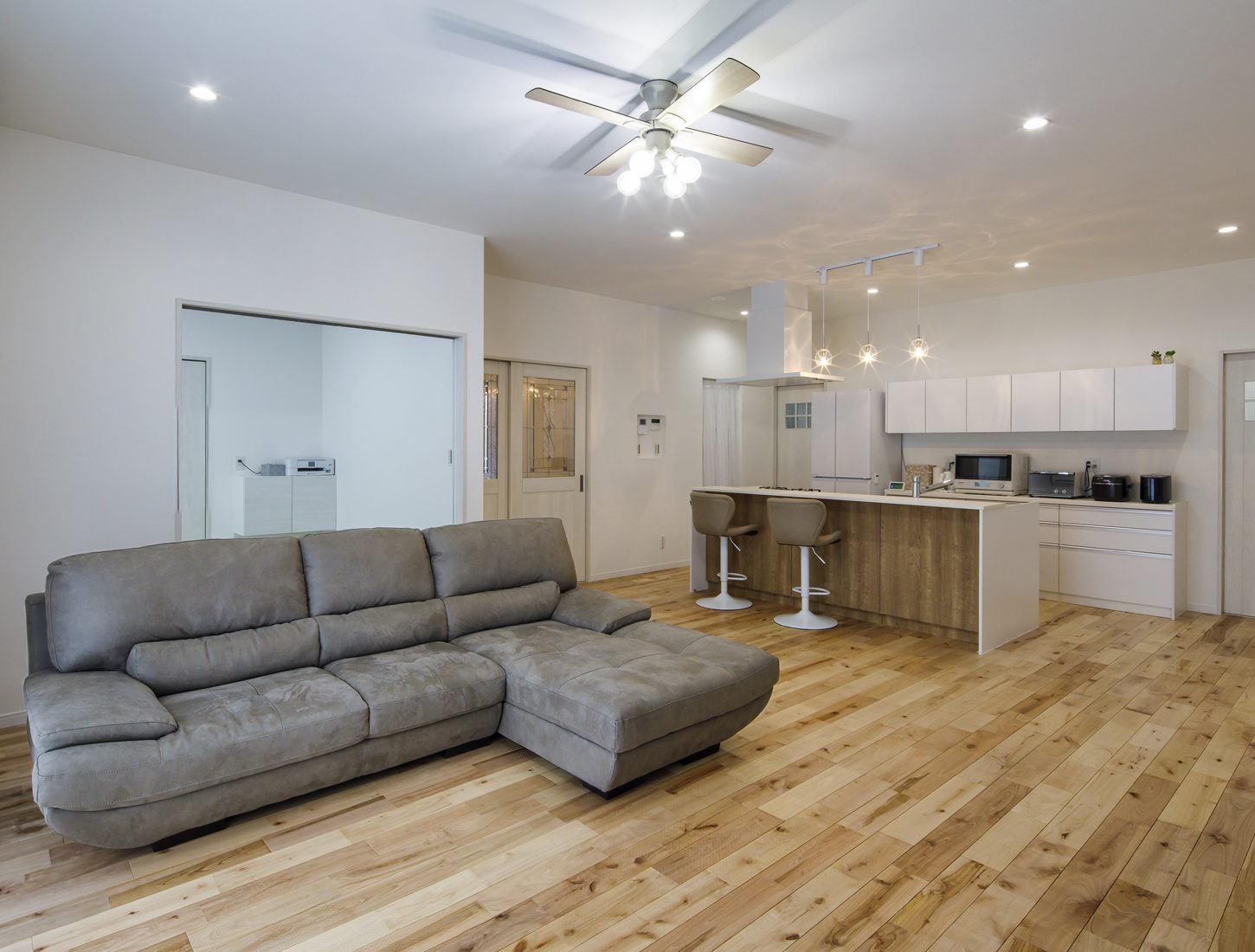 Tさん夫妻の希望通り、生活の中心は23帖の広さを取ったLDKである。無垢のフローリングはサクラを選び、温かみのある色味が白で統一された空間に映える。普段は二人暮らしだが、お盆や年末には子どもたちとその家族が集まるため宿泊できるスペースも確保した。妻のKさんは、希望通りになった行き止まりのない動線が特に気に入っている。「家事がスムーズに進むのが何よりうれしいです」と笑顔を見せる。