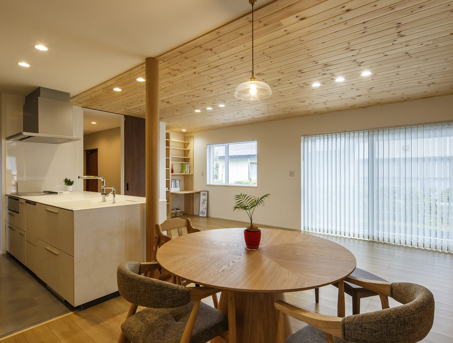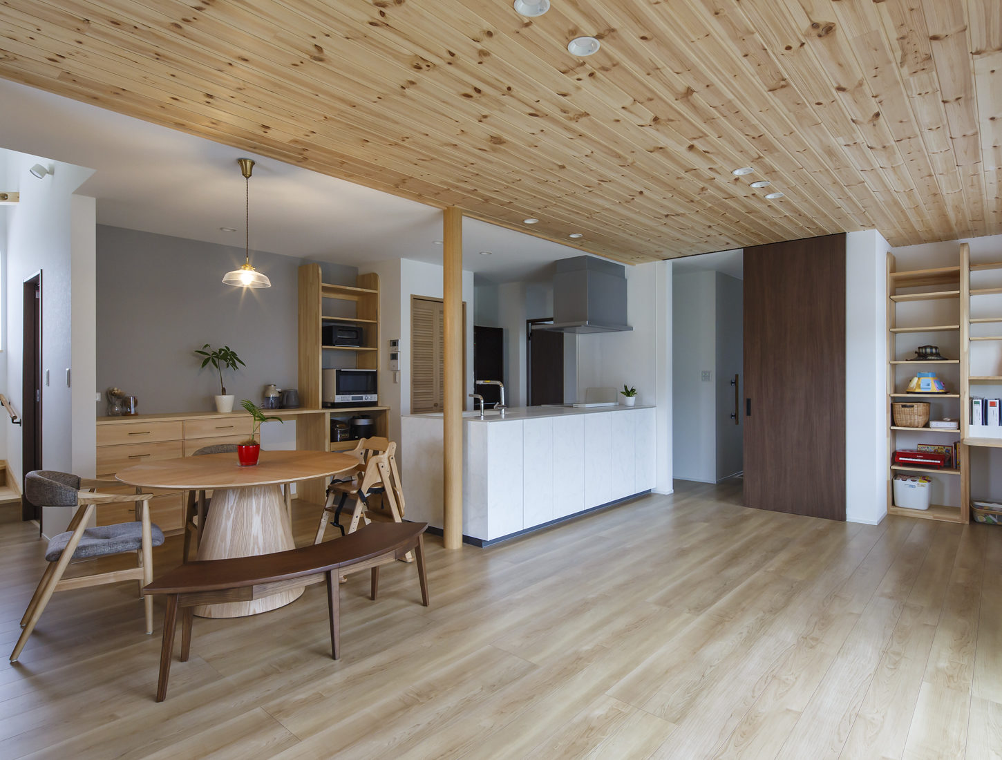 空間は全体的に角を減らし丸みを持たせることで柔らかな印象に仕上げた。ハイドアを採用して開放感を演出したことも功を奏して、穏やかで優しい印象の空間デザインが実現している。「住宅性能が高くて快適。すぐ帰ってきたくなる家なんですよね」と微笑むIさん夫妻。住まい手のその一言が、この家の完成度を物語っている。