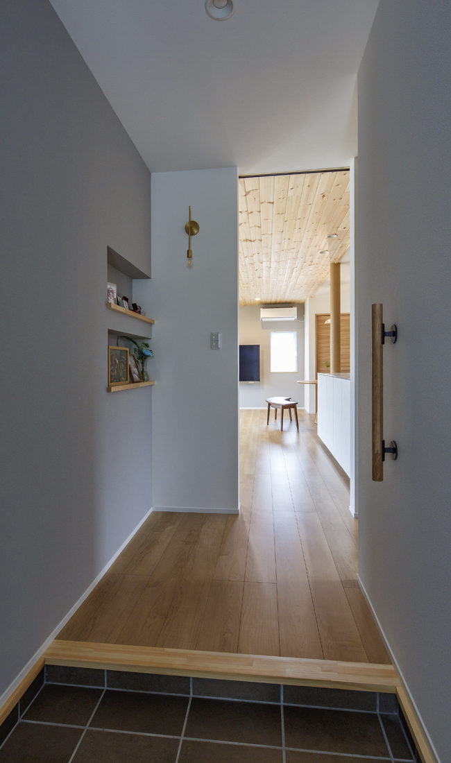 来客用と家族用で動線を分けた玄関は、明るく広々としていてIさん夫妻のお気に入りだ。アプローチや壁のニッチがさりげなく来訪者を迎え、空間に奥行きを与えている。シューズクロークには下がり壁を設けることで、採光と収納を両立。複雑な構造にせず、シンプルな工夫で快適性を高めている。