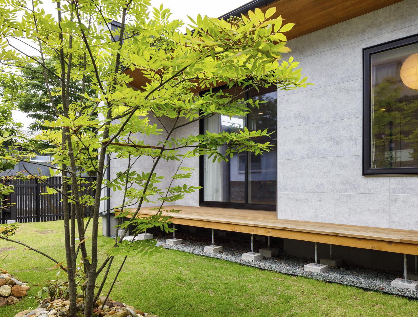 塗り壁の質感がある外壁が張られた、すっきりとしたたたずまい。玄関周りにあしらわれた木材が外観のアクセントとなり、木をふんだんに用いた室内とのつながりをうかがわせる。「いろいろとやりくりしてもらったおかげで、自分たちの予算の範囲内でも妥協することなく、木を使った家をつくることができました」と、Iさん夫妻は満足そうに話す。