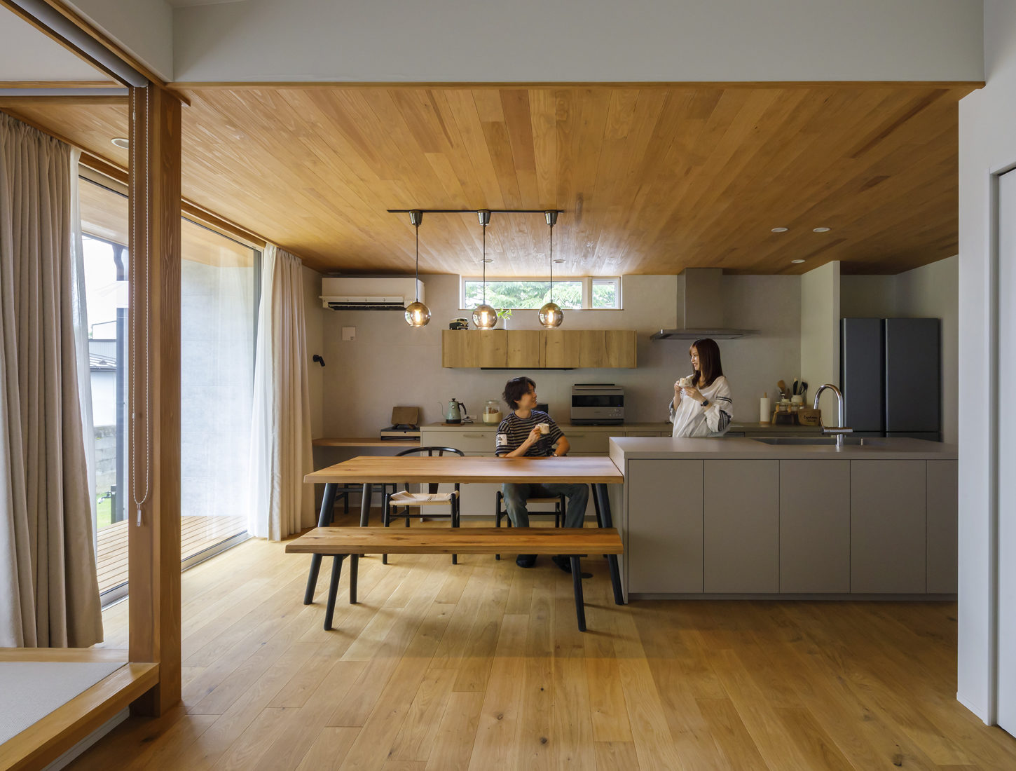 「生活の基本的な機能は1階にまとめて、回遊動線にしたい」というのが、ご夫妻の大きな希望だった。家の中をスムーズに移動でき、家事効率の良さにもつながるからだ。キッチンとダイニングは横並びに配置し、配膳や片づけの負担を減らす工夫も。リビングの一角には、くつろぎの場として畳敷きの小上がりを設け、家族が思い思いに過ごせる空間をつくった。内装は木とベージュを基調とした穏やかな雰囲気に。いずれの希望もスムーズにかたちになり、間取りについては大きな変更はほとんどなかったという。木材を使った家にしたいという思いから、キッチンの天井はスギ板張り、1階床はオークの無垢材のフローリングを採用した。本物の木材で揃えられたことはIさんらにとってうれしいポイントだ。