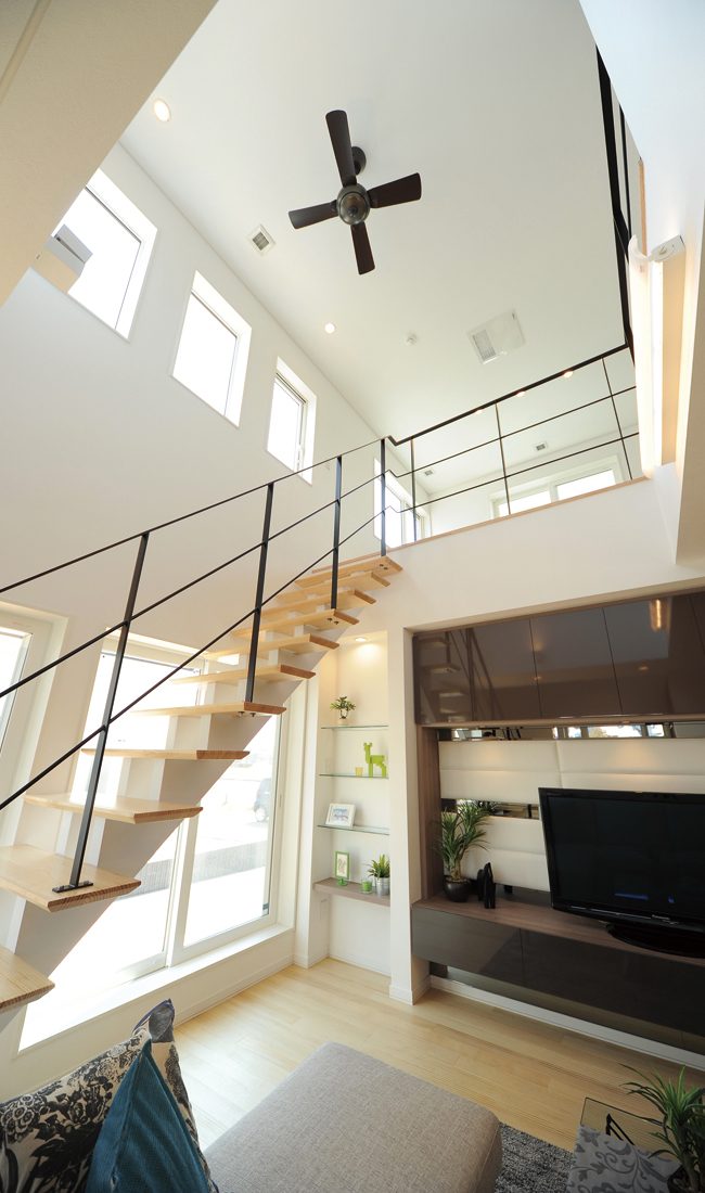 Sさんがサンコーホームに感じた第一印象のとおり、大きな吹き抜けが印象的なS邸。「キッチンからは吹き抜けを通して2階にいる家族の気配も感じられ、正面の大開口の開放感も気持良く、ウッドデッキで遊ぶ子どもたちを作業しながら見守ることもできる」と妻のAさんも満足げだ。吹き抜けの大きさと大開口で冬の寒さが気になるが、オリジナルの空調システムが家全体を同じ温度に保っている。Sさんお気に入りのスキップフロアは小学校に入学したてのみゆちゃんの勉強スペースとして、そして、仲の良い3姉妹の遊び場として大活躍だ。