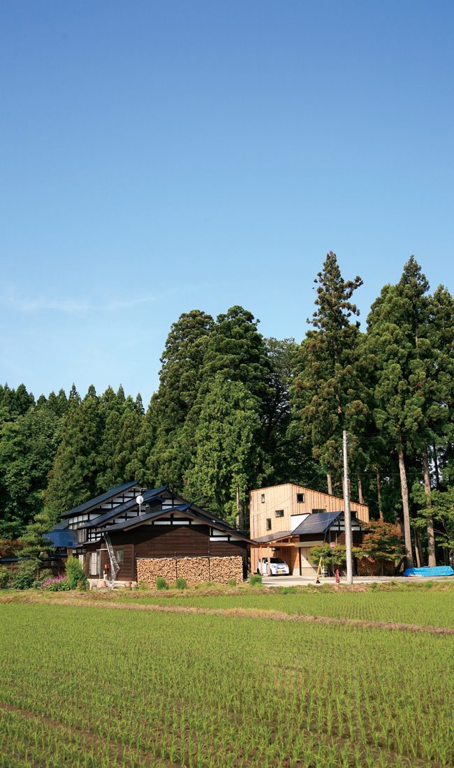田んぼの真ん中にある林の脇に、築150年という漆喰壁の大きな古民家が見える。同じ敷地内に寄り添うようにして建つT邸は、杉板張りの外観が、周囲の景観になじみつつ、爽やかな存在感を放っている。