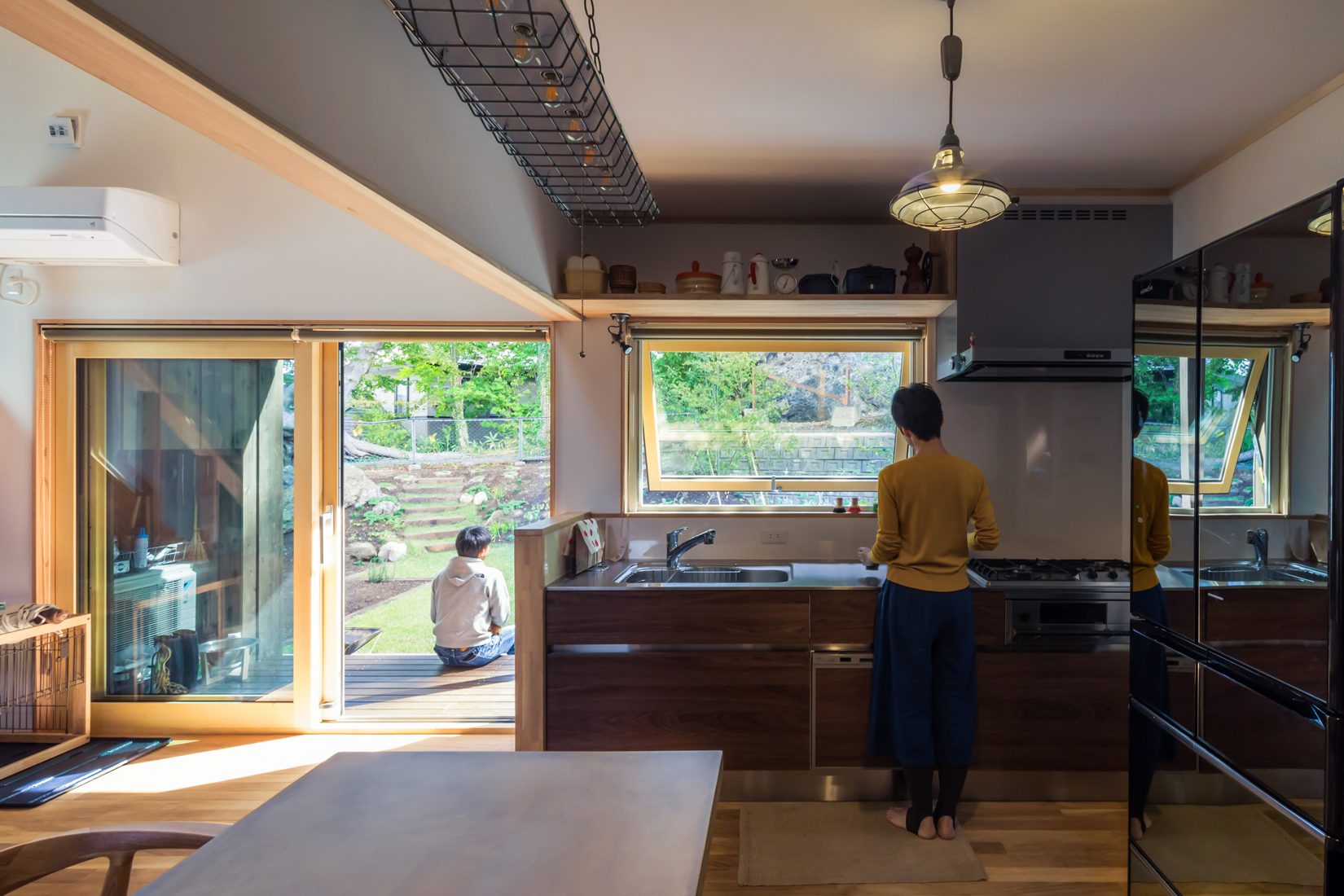 I邸は庭に面したキッチンと薪ストーブのあるリビングを中心に、ほぼすべての部屋が庭に面している。「以前は市街地のマンション住まいだったので、こうして寝ても覚めても緑を眺めながら暮らせるなんて夢のようです」とMさんの微笑む姿も、この家にぴったりとなじんでいるのが印象的だった。