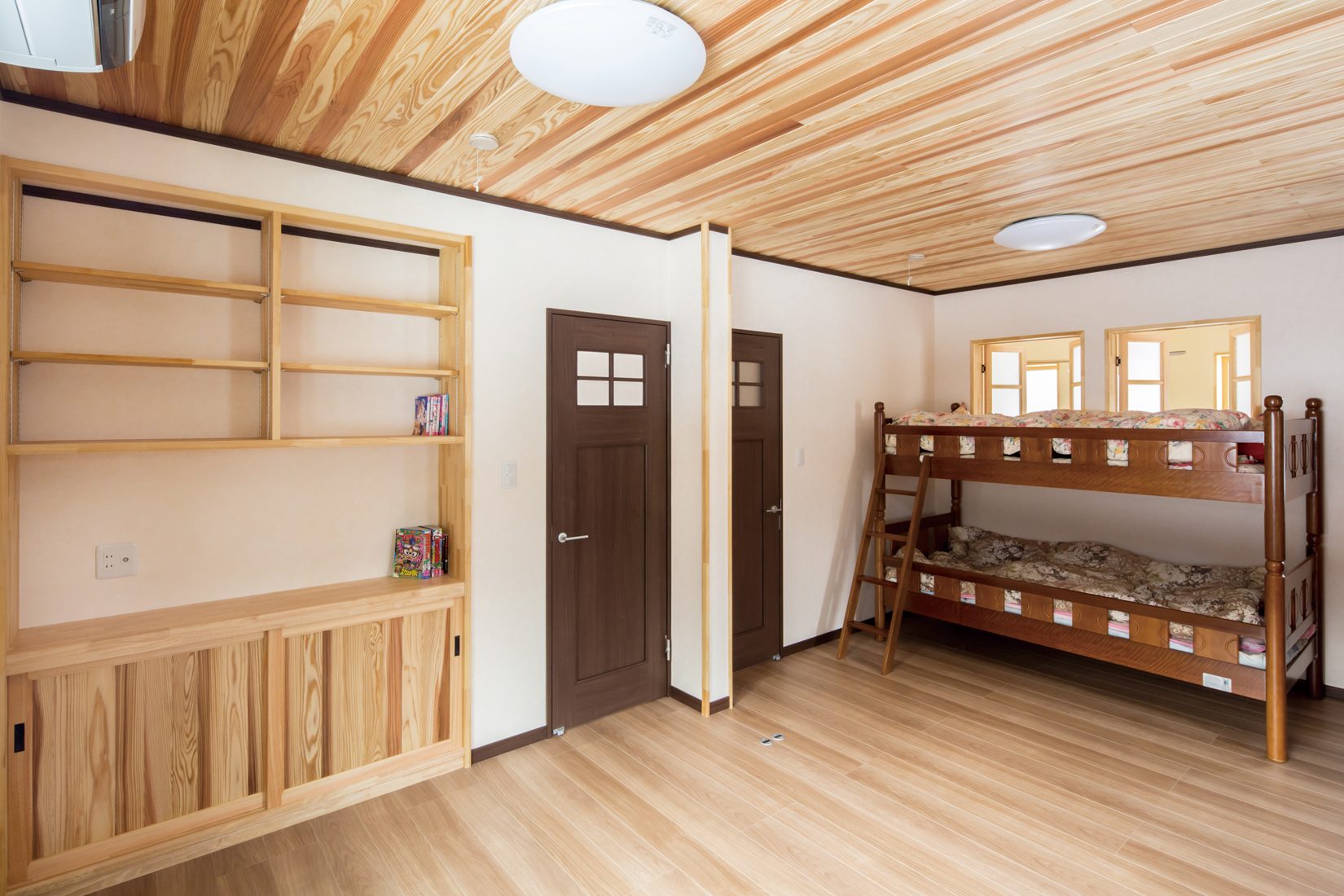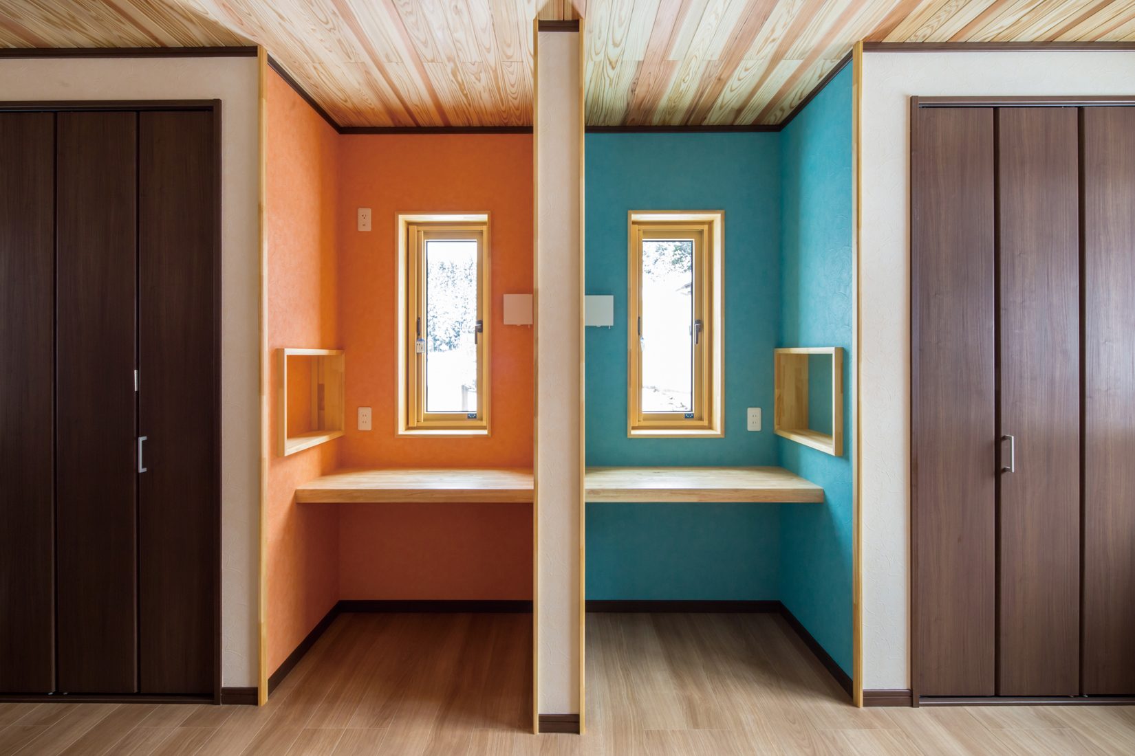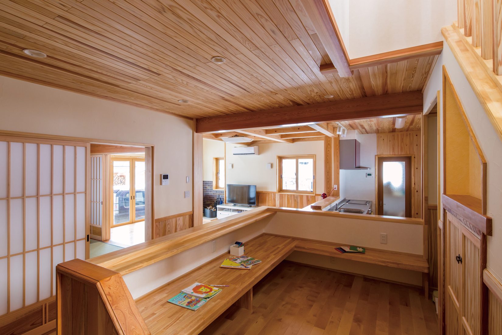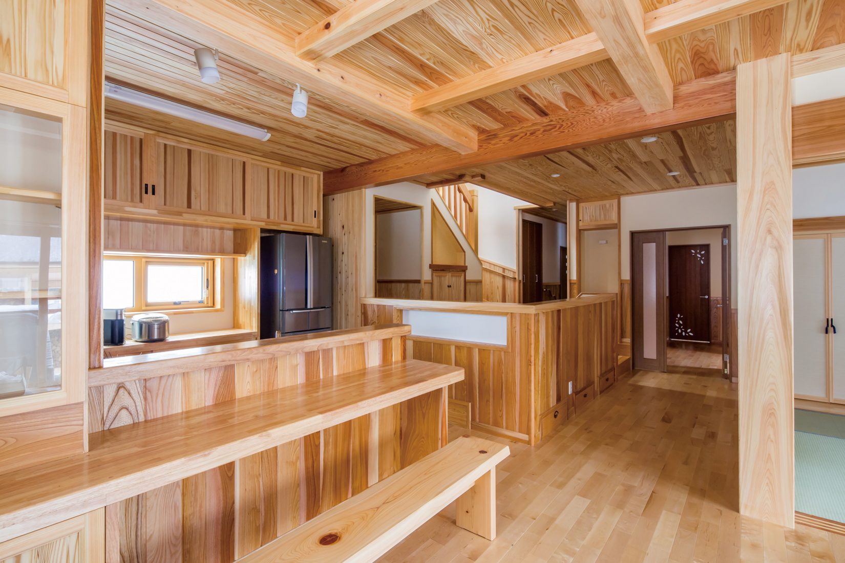 A邸はAさんを中心に、妻のHさん、Aさんの母と3人の子どもという6人家族が暮らしている。「実家の老朽化と冬の寒さが体にも堪えるし、子どもたちの成長に伴って家を新築したいね、と話していました」とAさん。こうして、実家の敷地内に新居を構えるという計画で、家づくりがスタート。「地元のビルダーで家を建てたいと思ってビルダー探しをしました。通し柱を必ず使う点と、木材に塗り壁など自然素材をふんだんに使った家づくりをしている点で、アベ建さんのこだわりに共感したのです(Aさん)」。A邸では床にカバザクラ、腰板の一部にケヤキ、ブナ、ヒバ、天井にスギ、通し柱にヒノキと、樹種の特性に合わせて材を使い分けている。