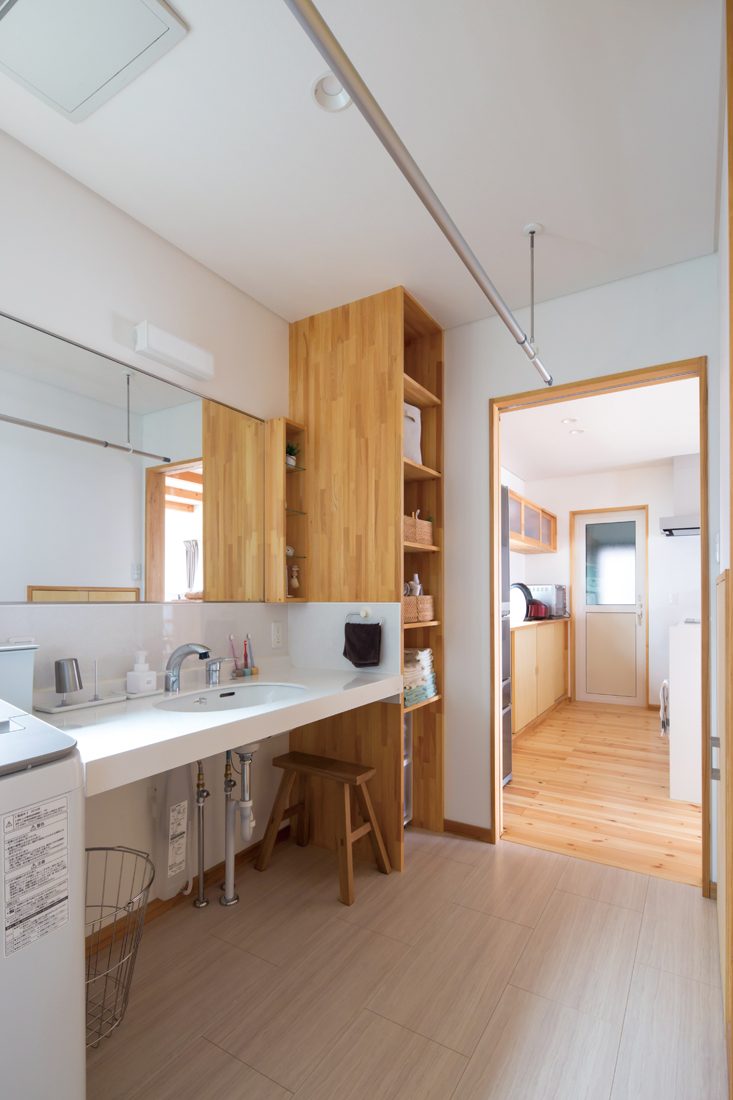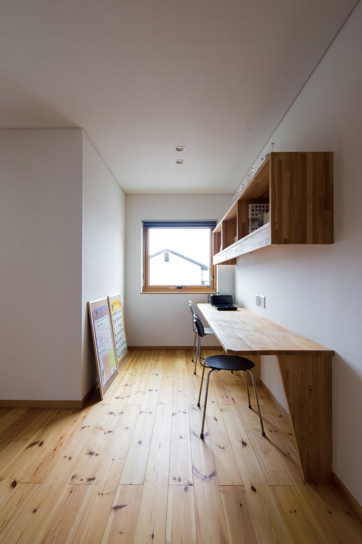 もう一つのEさん夫妻の希望が自然素材を使った家ということ。ドリームビルドのモデルハウスで触れた無垢材と漆喰塗り壁で意匠された室内空間に惹かれた一方で外観のガルバリウムとのギャップも「木の家になり過ぎない感じが良かった(Eさん)」という。さらにE邸では、床材や漆喰塗り壁の質感に合わせて、造り付けの家具のみならず、建具もすべて国産アカマツの集成材やシナベニヤなどで造作。夫妻で選んだというHIDAの家具との相性も良く、夫妻の志向が表現されている。