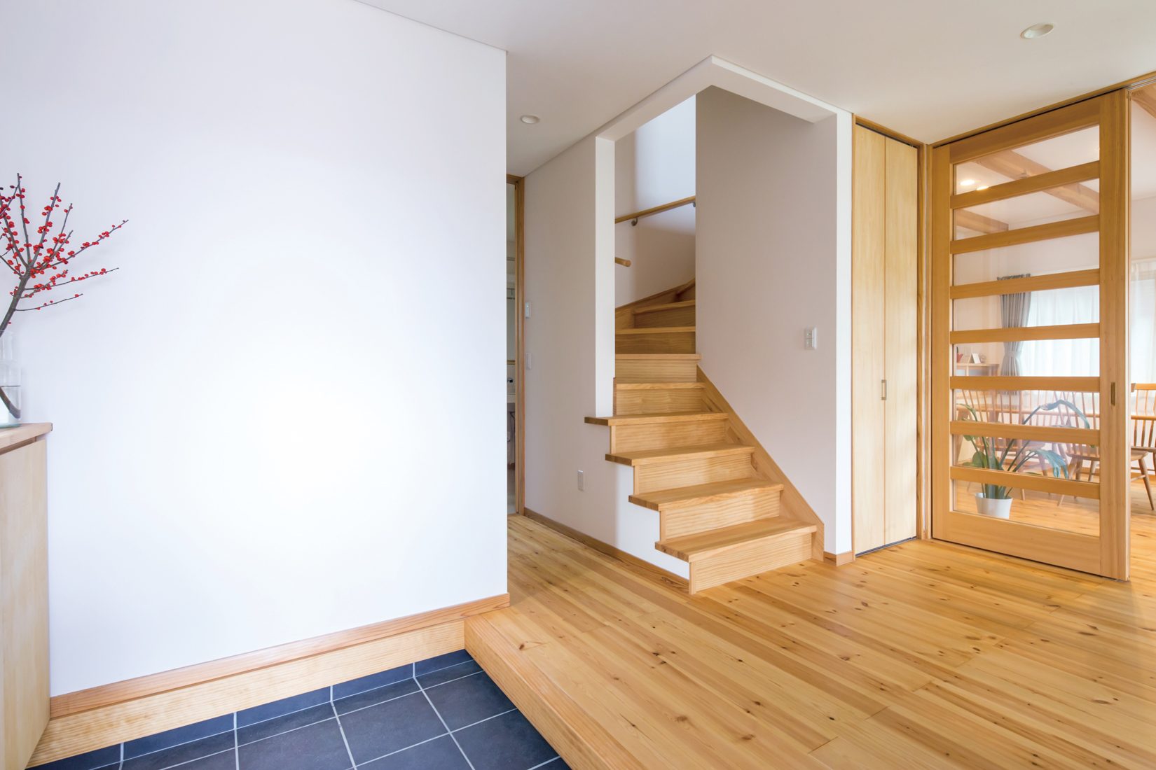 玄関までがワンフロアの開放感 制作建具も素敵な自然素朴の家
