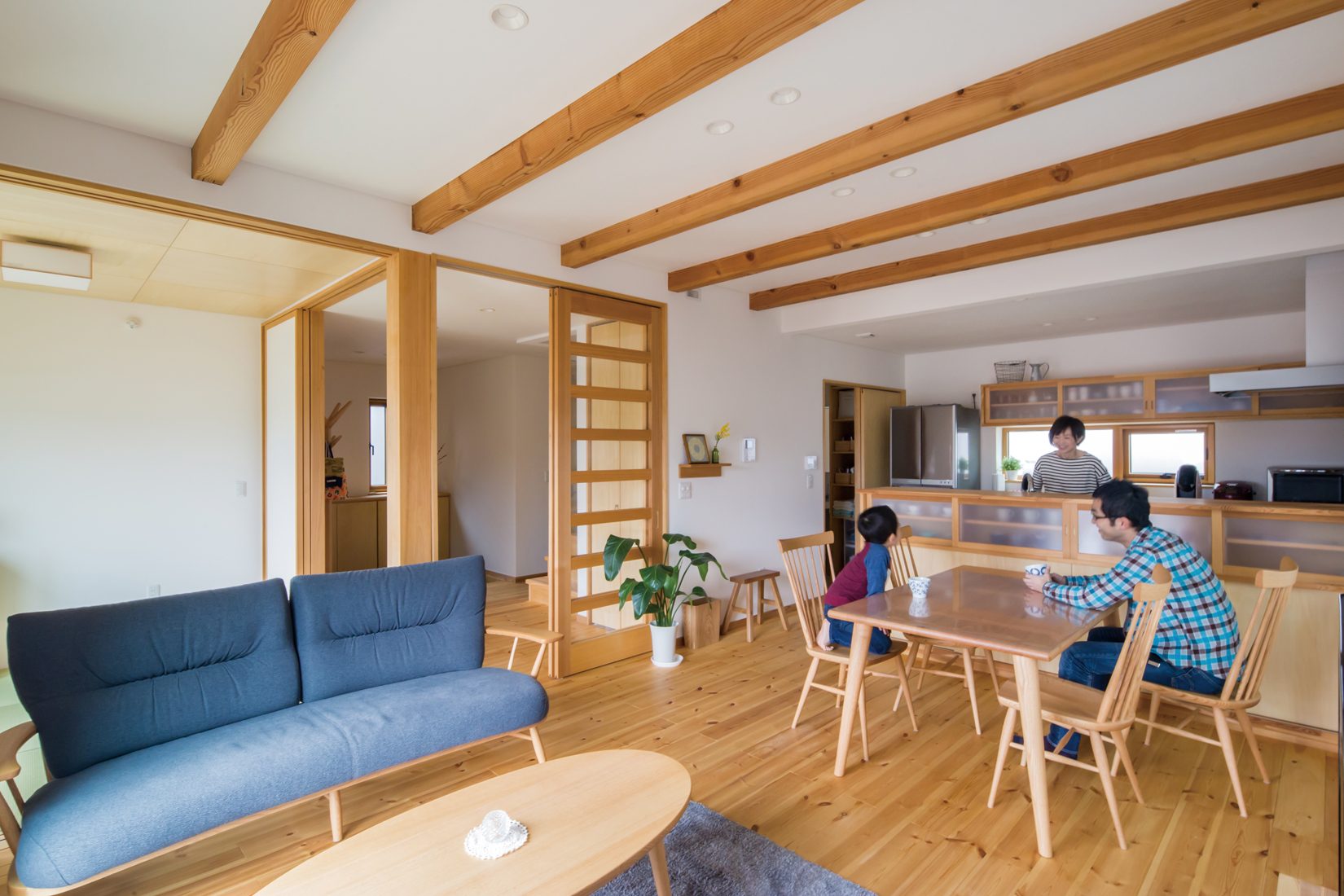 スペースを区切る壁を極力なくし、室内は2400ミリメートルの製作建具で統一。玄関ホールとLDKの仕切りには視線を遮ることがないようガラスの引き違い戸を採用。そして、横の広がりだけでなく、梁をあらわすことで天井高を上げ、縦への広がりもつくり出した。いずれも高い断熱性能が可能にした開放感だ。